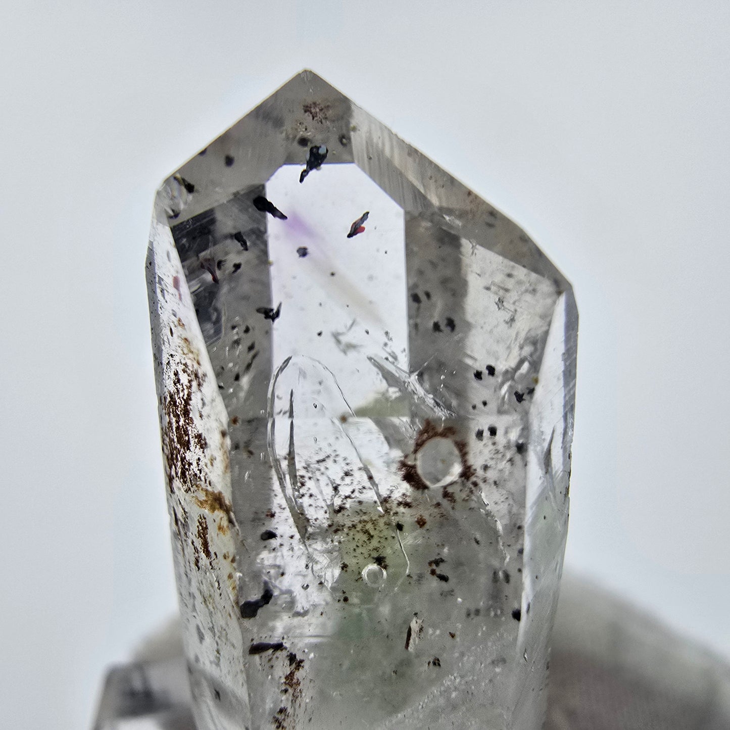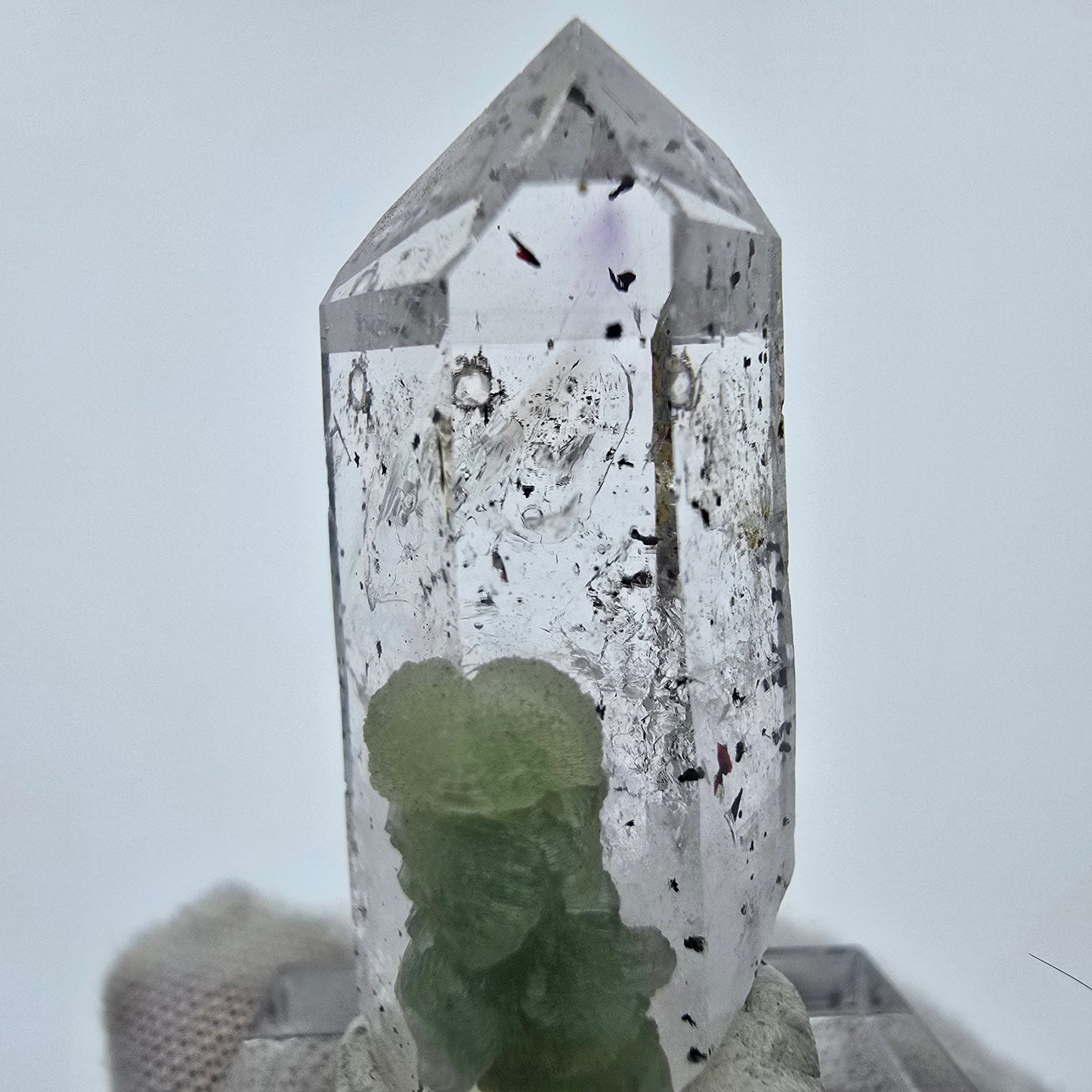 Discover this rare clear Harlequin Amethyst crystal point, which impresses with a purple-white, transparent tip and fascinating phantoms inside. This unique crystal point contains extremely rare red shiny hematite inclusions that characterize the Harlequin Quartz. In addition, there are numerous green-transparent, shell-shaped prehnite crystals and white-transparent analcime crystals on the crystal, which give the piece further charm.