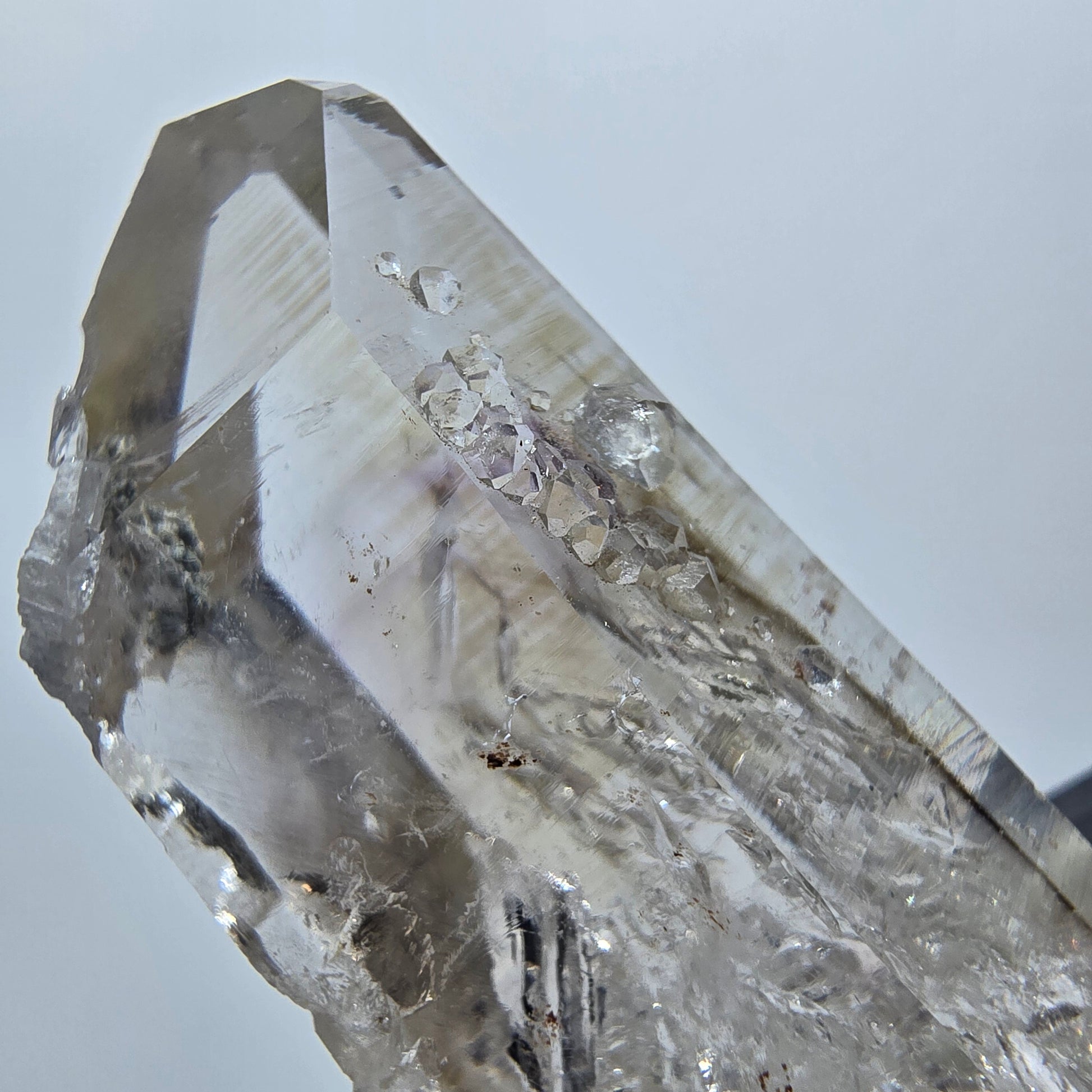 Rare enhydro Lemurian quartz with analcime from the Streep Mine in Goboboseb, Namibia – a fascinating collector's item with a clear, white-brown transparent crystal tip and beautiful internal phantoms. The erupted analcime crystals and the characteristic horizontal grooves on the surface are particularly appealing.