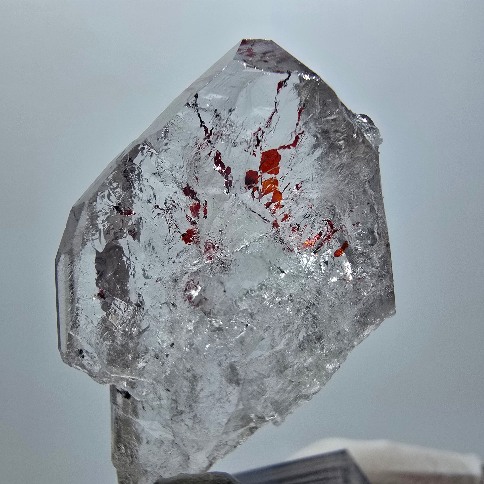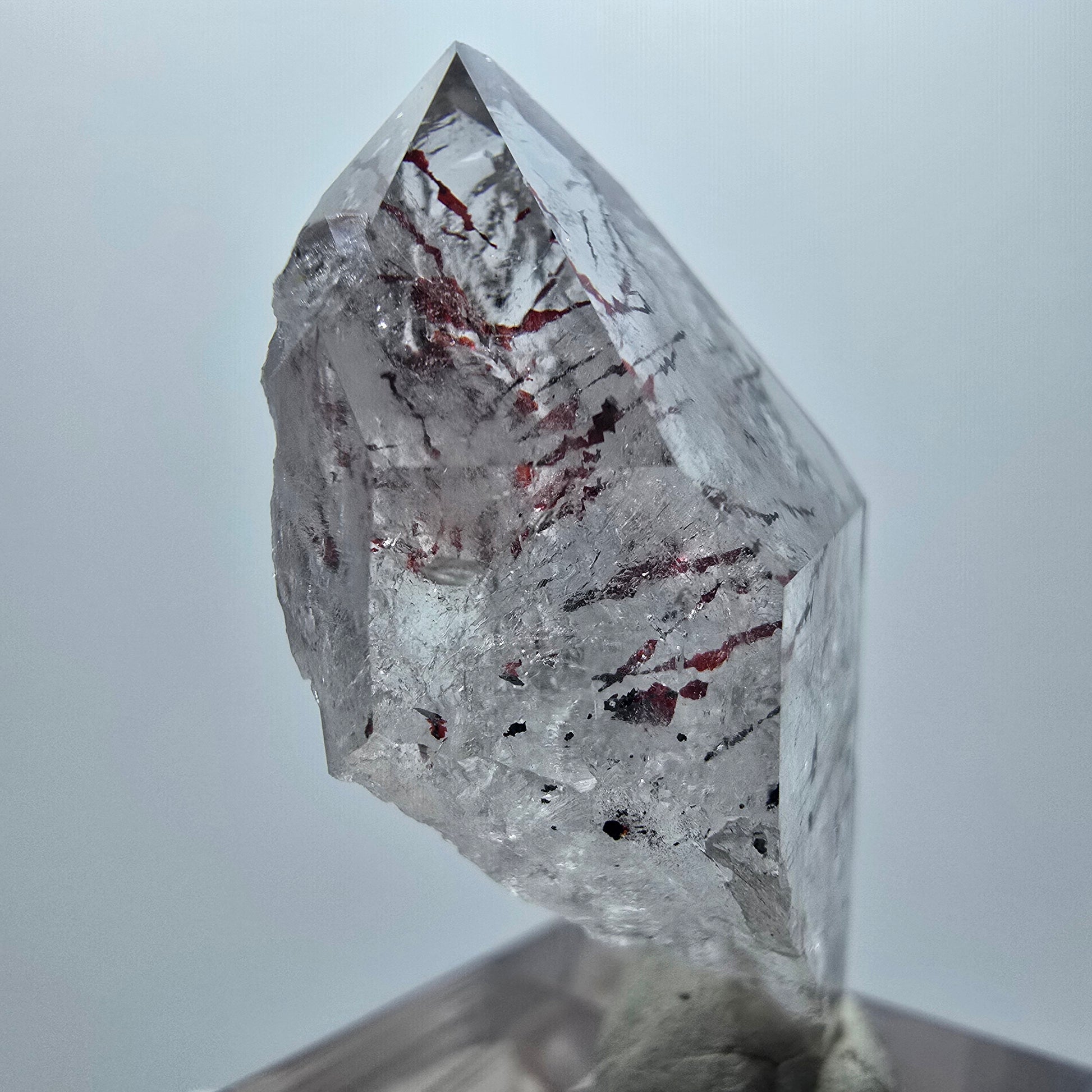 Harlequin Phantom Quartz Point from the legendary Streep Mine in Goboboseb, Namibia – a rare find with a clear, transparent structure and fascinating internal phantoms. This exceptional crystal point is distinguished by beautiful red, needle-shaped hematite inclusions, which give the mineral its characteristic harlequin pattern.
