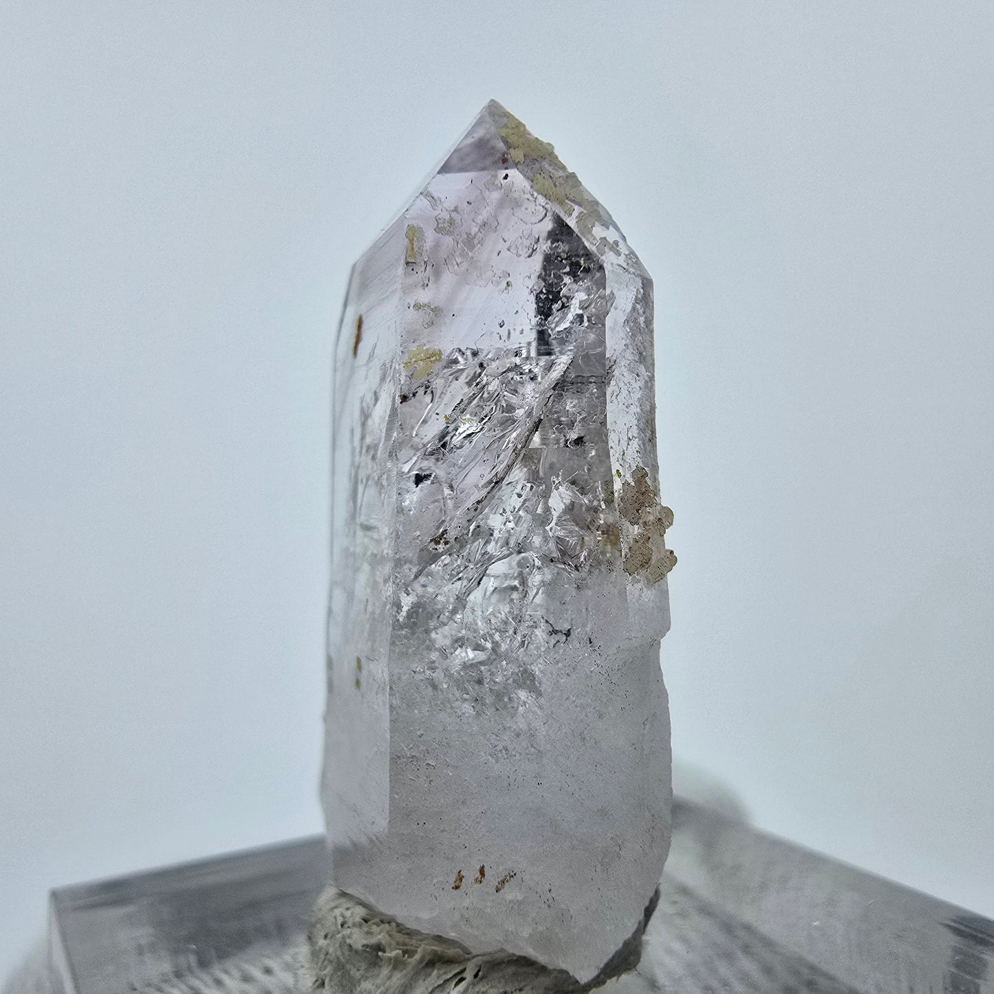 Discover the mesmerizing beauty of our Lemurian Phantom Amethyst, which not only boasts a rare, clear purple-white transparency but also possesses extraordinary phantom structures within. This impressive crystal point is a remarkable Lemurian Quartz, enhanced with horizontally grown transverse grooves on its surface, thus taking any collector's breath away.