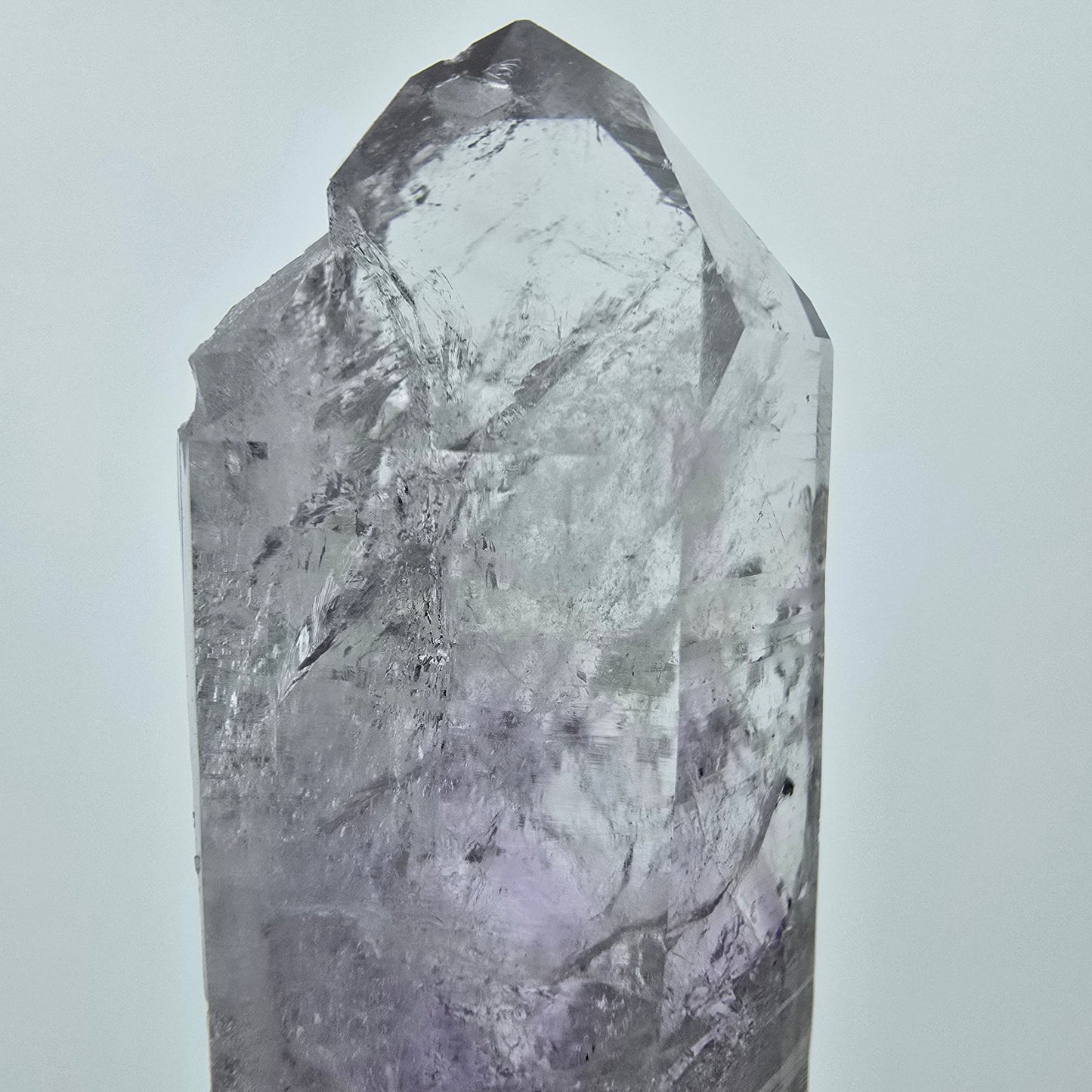 Discover our exquisite Phantom Amethyst crystal point, rich in unique properties. This particular piece showcases a beautiful purple, white translucent crystal formation, with mesmerizing purple phantoms visible within. Nature's artistry is complemented by the presence of fine black Hematite crystals, harmoniously set within the crystal.