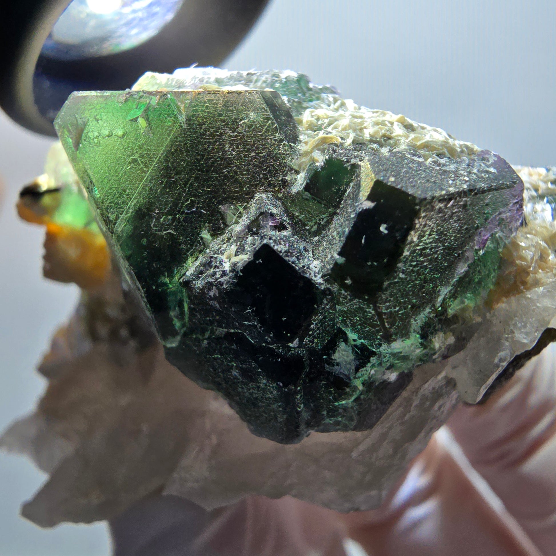 Rare mineral specimen with green-brown, transparent phantom fluorite cube crystals in partially hexagonal form from the Erongo, Namibia.