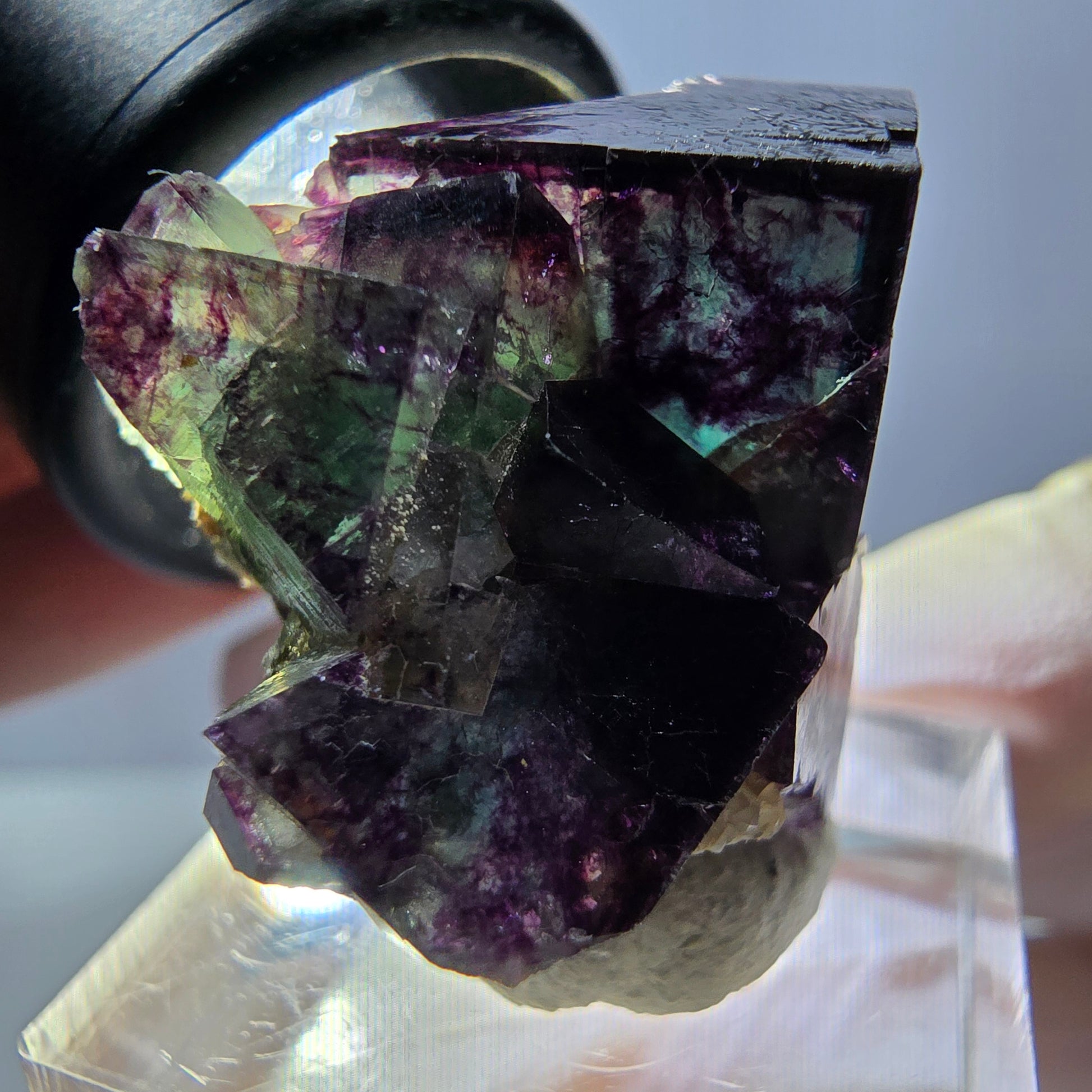 Discover this rare Phantom Fluorite Cube from Namibia, which captivates with its fascinating colors and impressive structure. The green-purple transparent, zonal fluorite cubes display beautiful phantoms within, which refract the light in a unique way and create an enchanting shimmer.