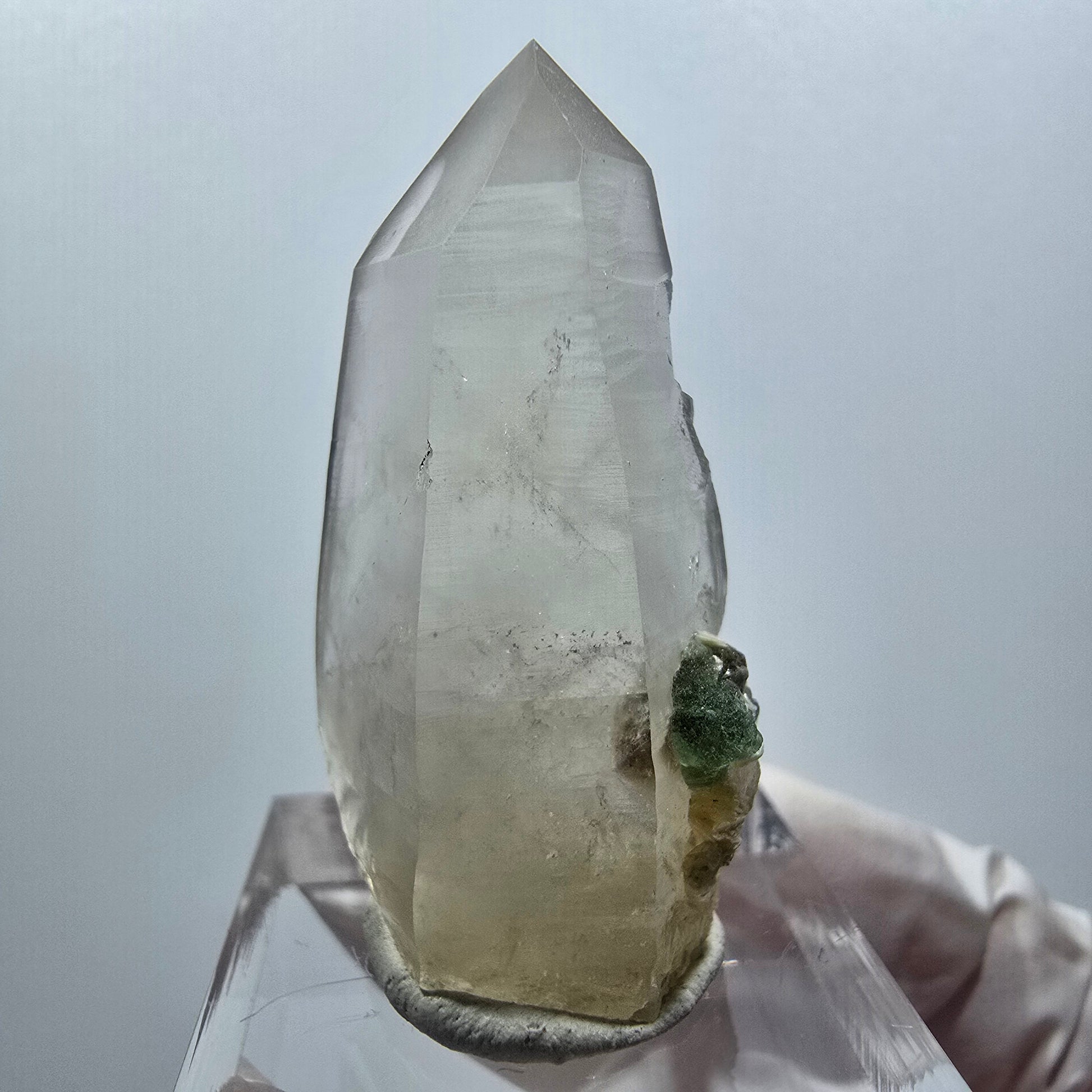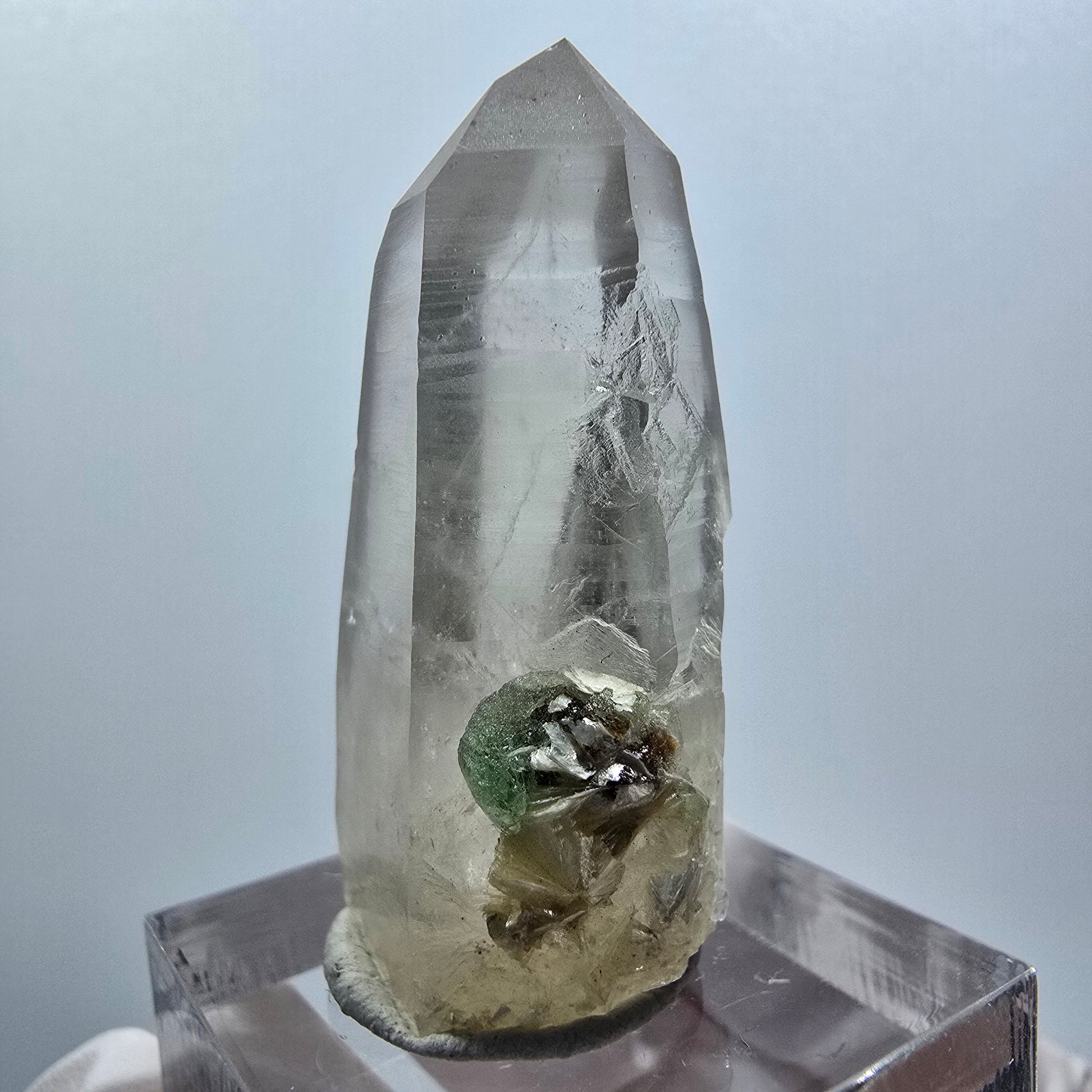 Discover this rare phantom skeleton smoky quartz , fluorite, and muscovite specimen from the Erongo region of Namibia. The grey-white transparent smoky quartz points exhibit a unique skeletal surface, complemented by green fluorite and yellow metallic-lustrous muscovite crystals.