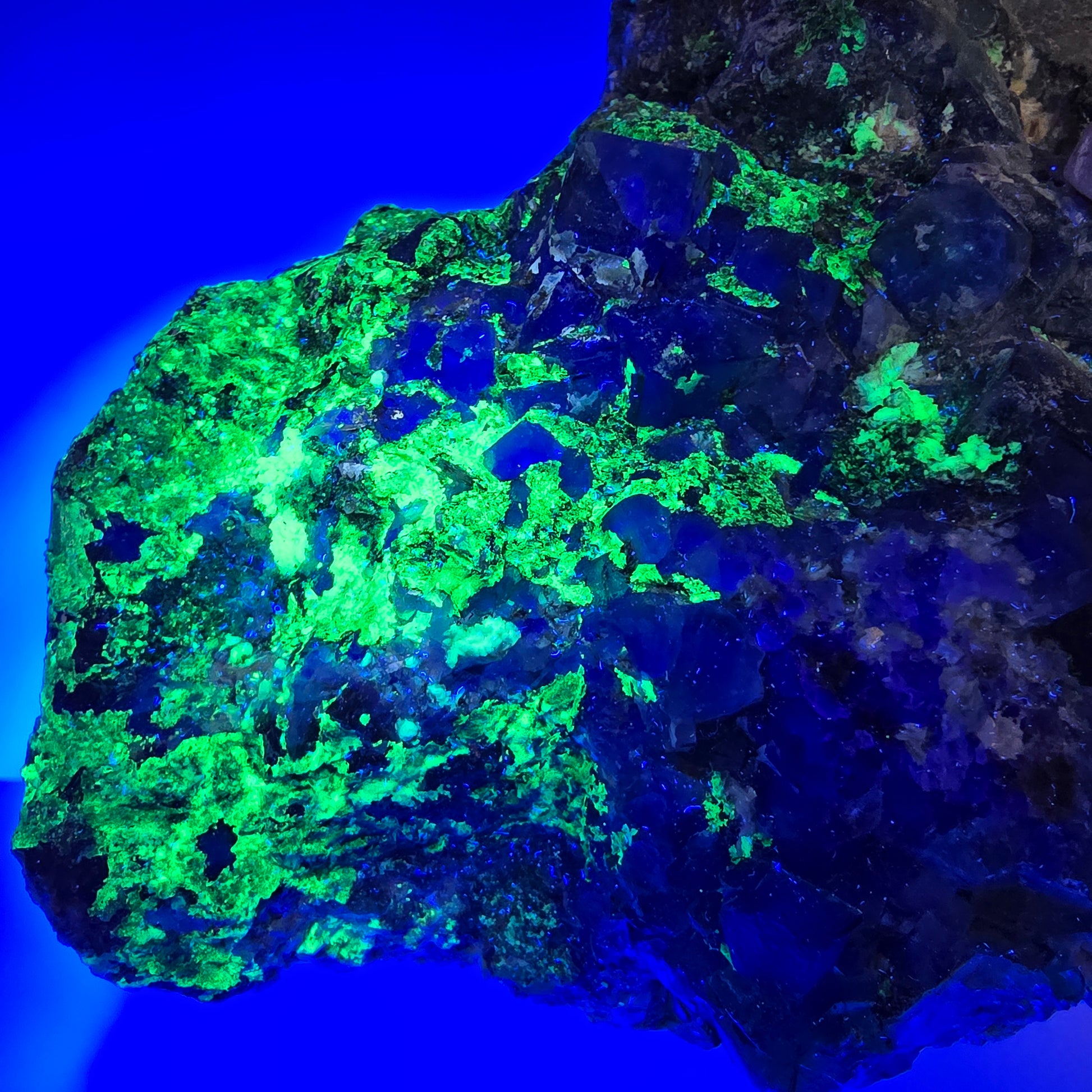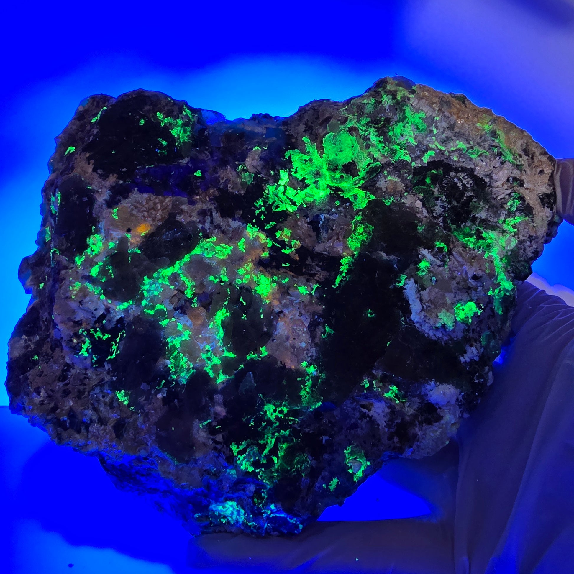 The hyalite crystals glow an intense neon yellow under UV light, giving the piece a special appeal. Measuring 150 × 129 × 55 mm and weighing 1009 g, this is an impressive collector's specimen from one of the world's most important mineral regions.