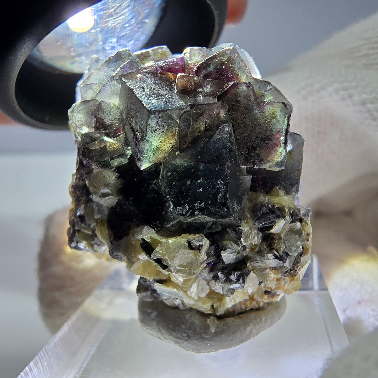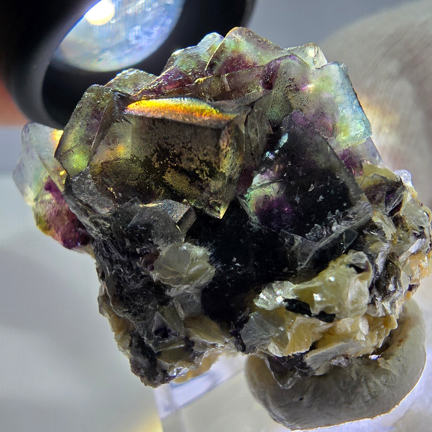 Découvrez ce spécimen minéral rare, captivant par ses cristaux impressionnants. Ses principaux atouts sont ses cubes de fluorite fantôme vert-brun-violet-jaune, transparents et clairs, où se dessinent de magnifiques fantômes. Outre ces fascinants cristaux de fluorite, vous y trouverez également d'élégants cristaux de tourmaline schorl noire, qui lui confèrent un caractère particulier. L'ensemble est complété par des cristaux de muscovite jaune, métalliques et brillants, qui se développent de façon spectaculaire sur le spécimen.