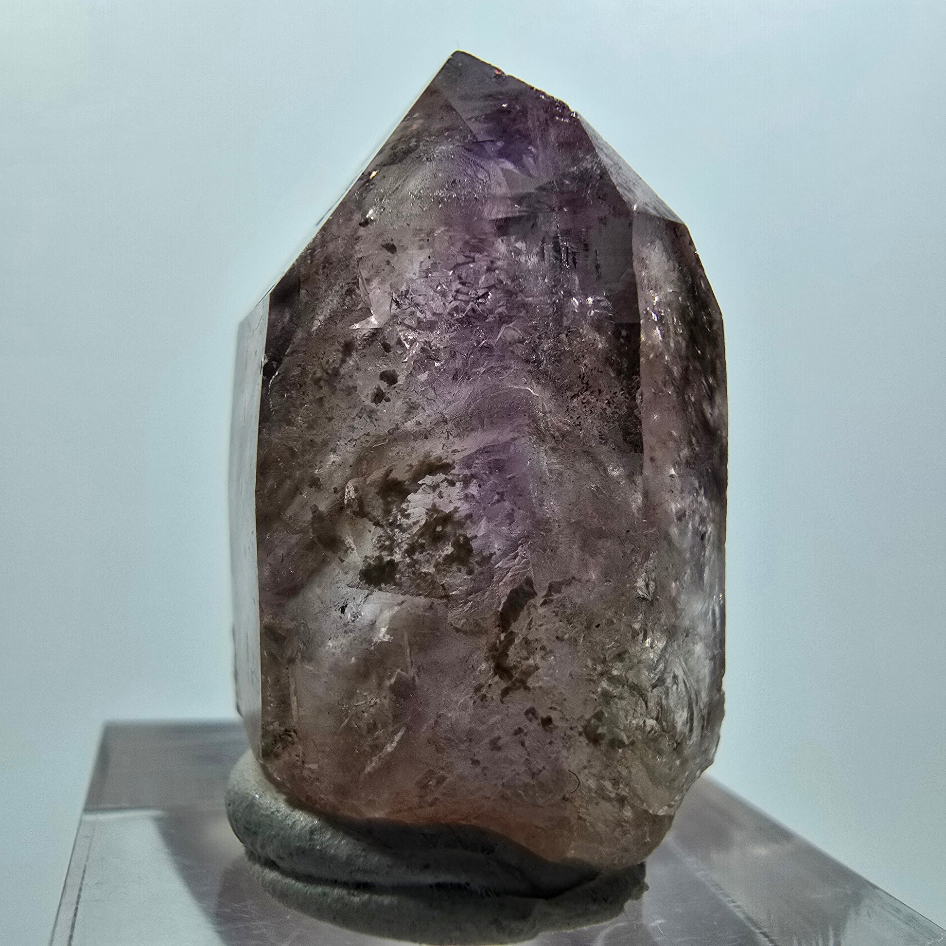 Rare pointe de cristal d'améthyste transparente, brun-violette, provenant de Goboboseb, en Namibie. Unique de par sa forme de sceptre et sa surface squelettique particulière, ornée d'inclusions en forme de fenêtres, elle révèle de magnifiques inclusions fantômes à l'intérieur, lui conférant un caractère exceptionnel.
