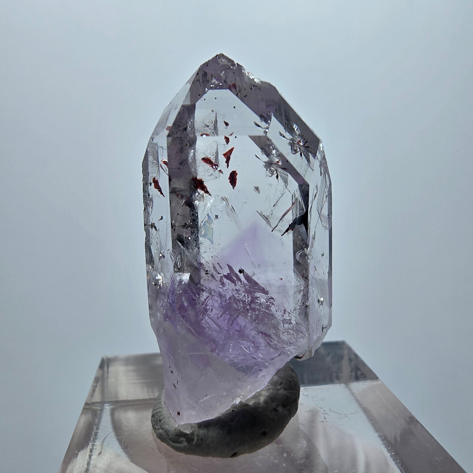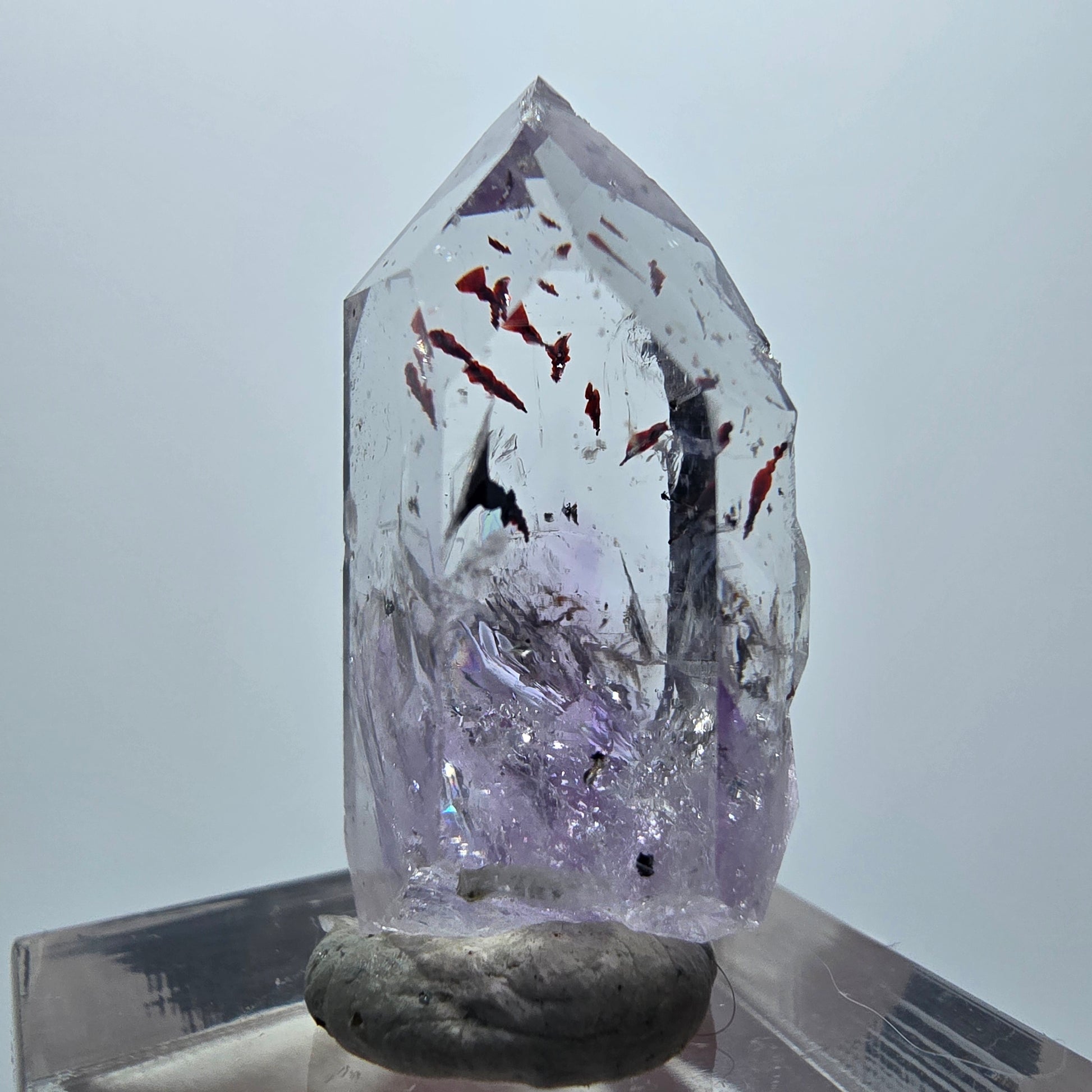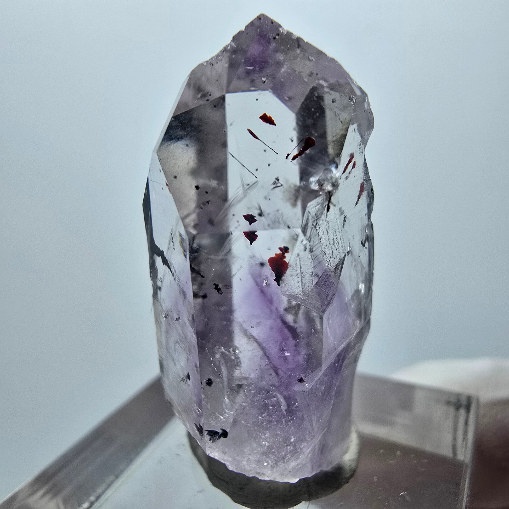 Une rare pointe d'améthyste fantôme lémurienne arlequin provenant de la mine de Streep à Goboboseb, en Namibie – une pièce de collection fascinante présentant des inclusions fantômes uniques et des inclusions d'hématite rouge et noire. La pointe de cristal transparente, d'un blanc violacé limpide, captive par sa coloration particulière et les rainures horizontales caractéristiques qui ornent sa surface.