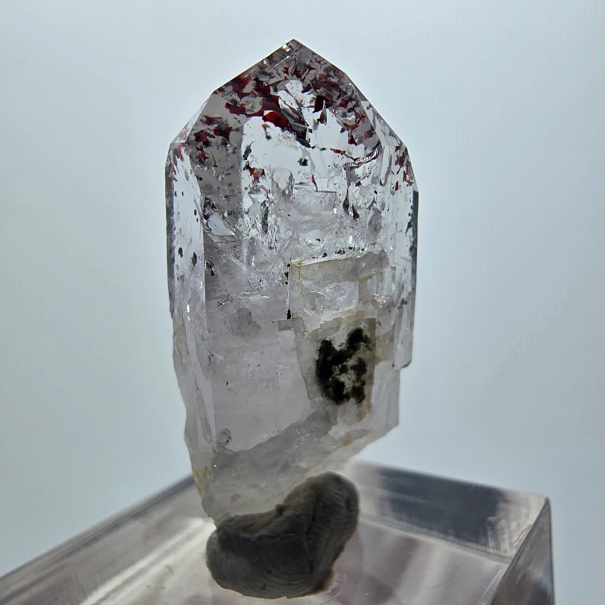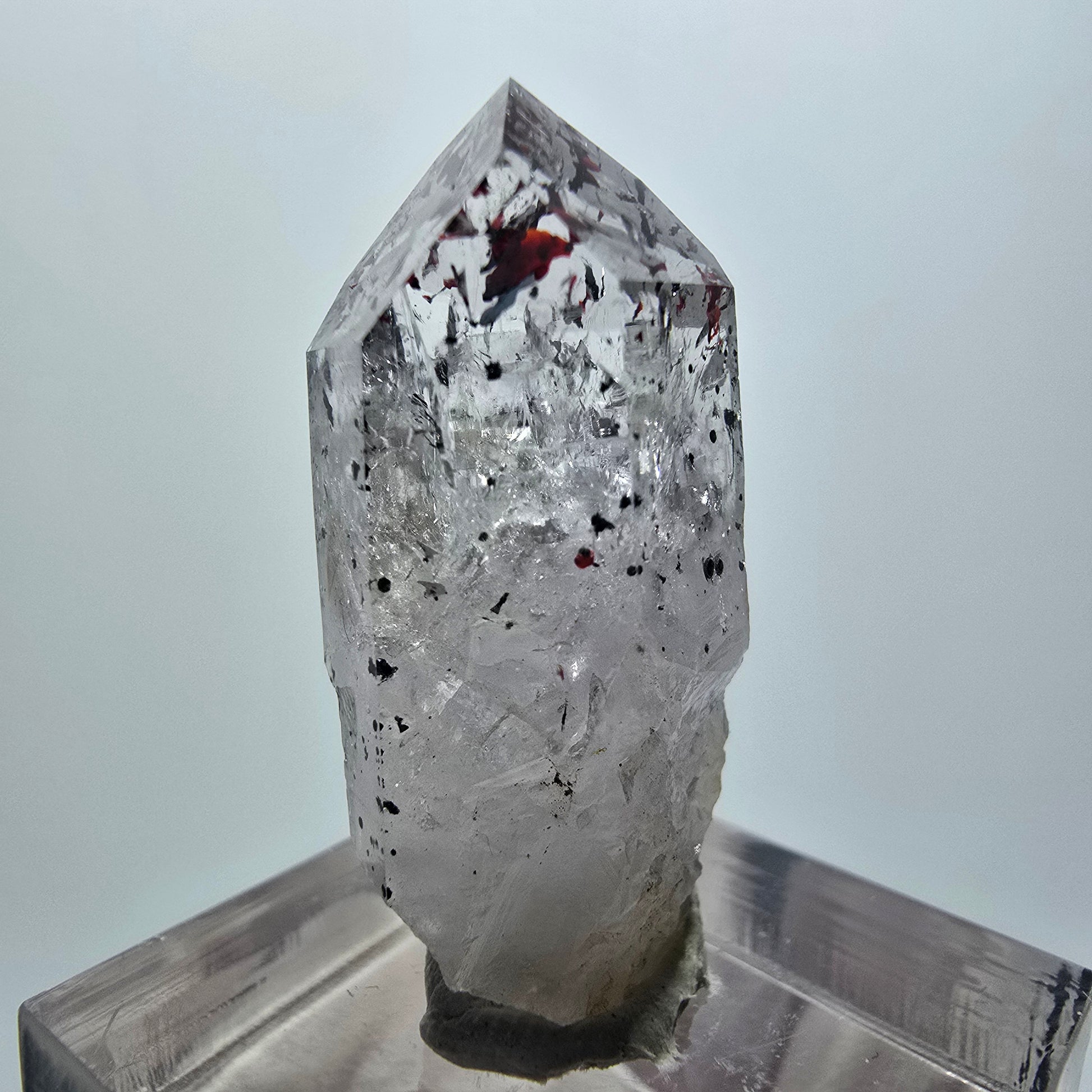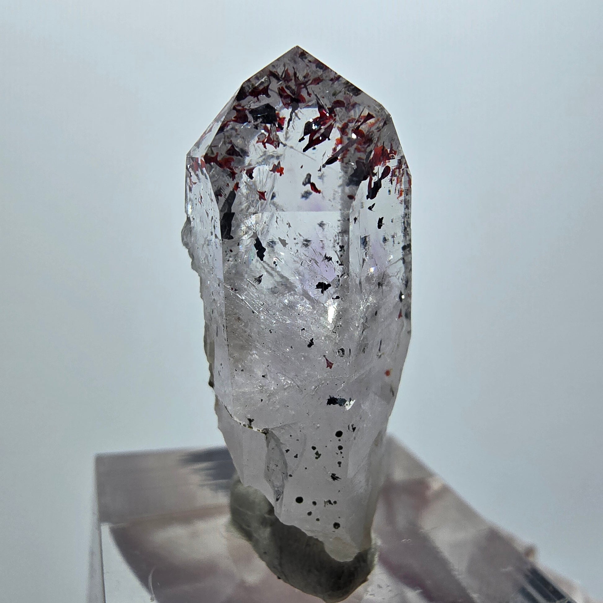 - Couleur : Transparent, violet, blanc, clair avec des inclusions d'hématite rouge et noire