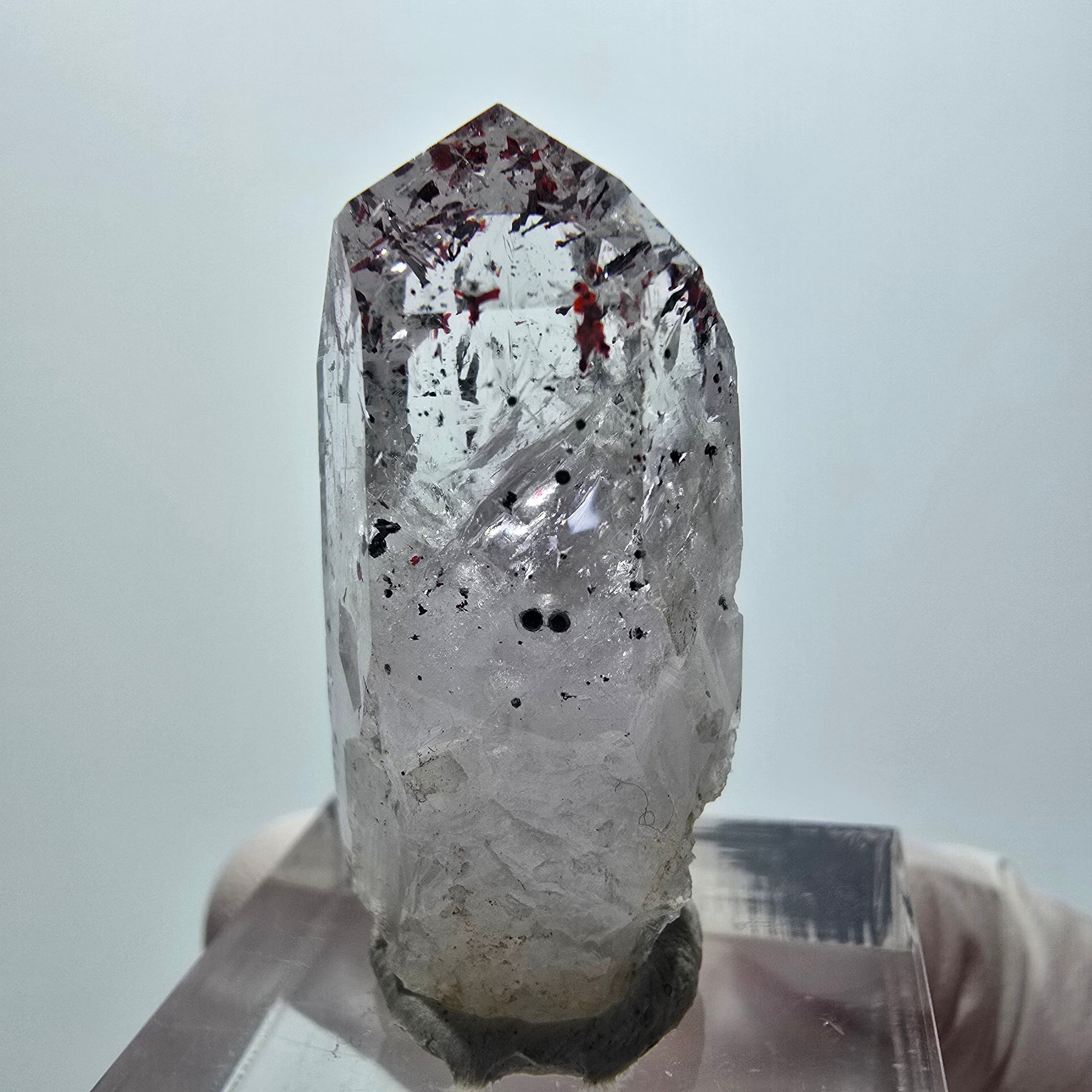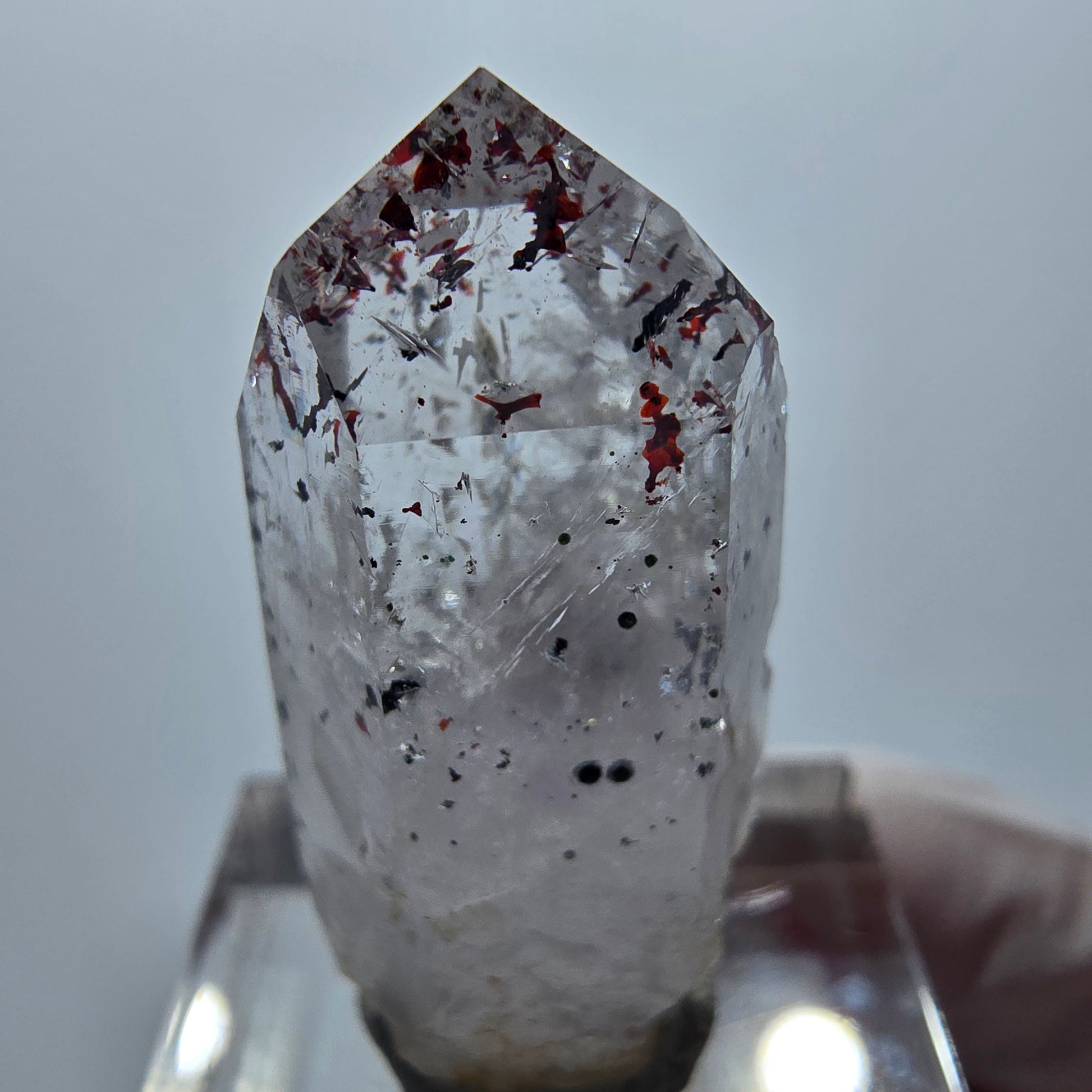 Une rare pointe d'améthyste fantôme lémurienne à motif arlequin, provenant de la mine de Streep à Goboboseb, en Namibie – un spécimen fascinant présentant des zones transparentes claires, violettes et blanches, ainsi que de remarquables inclusions d'hématite rouge et noire. La pointe révèle des fantômes distincts à l'intérieur et des rainures horizontales caractéristiques sur plusieurs faces, typiques du quartz lémurien.