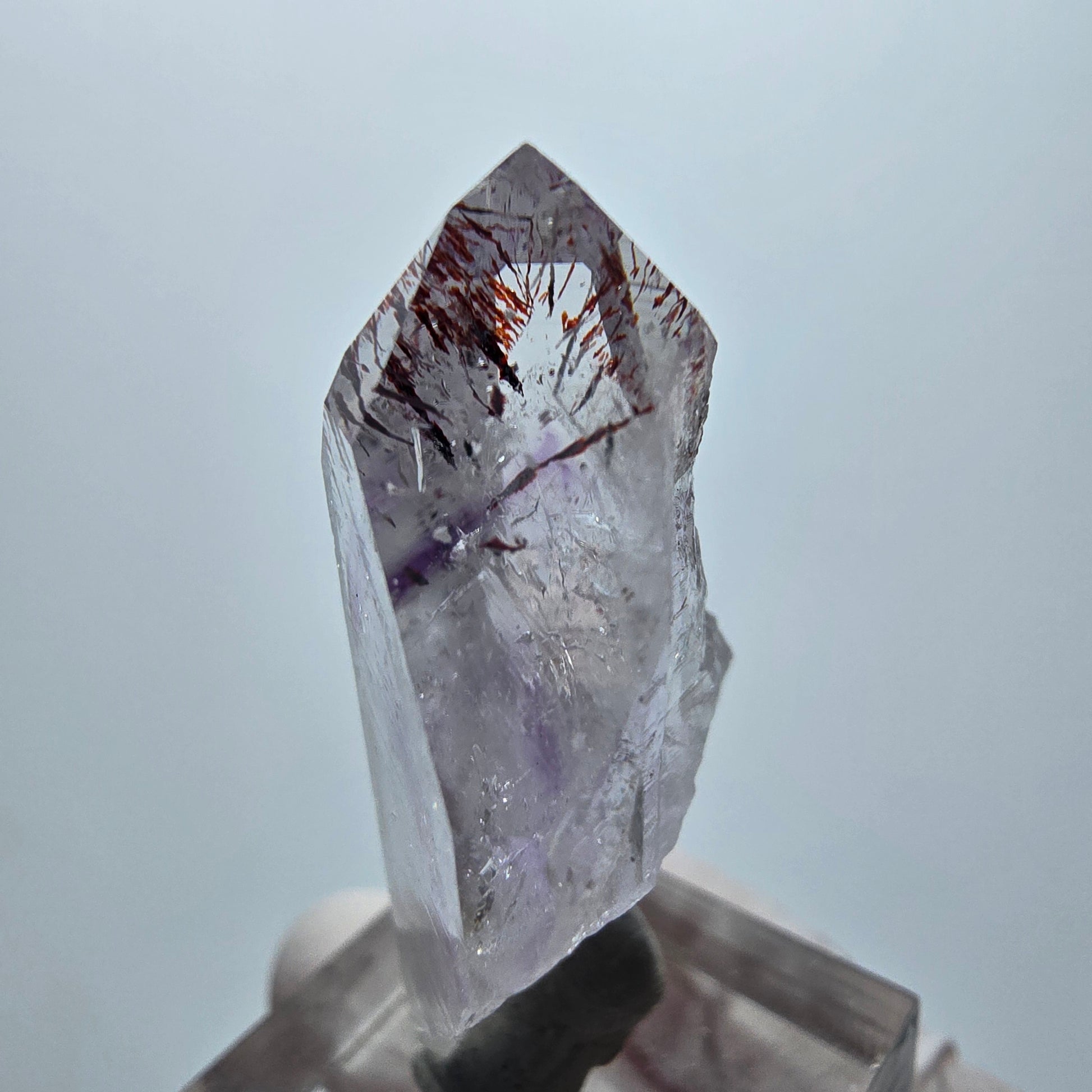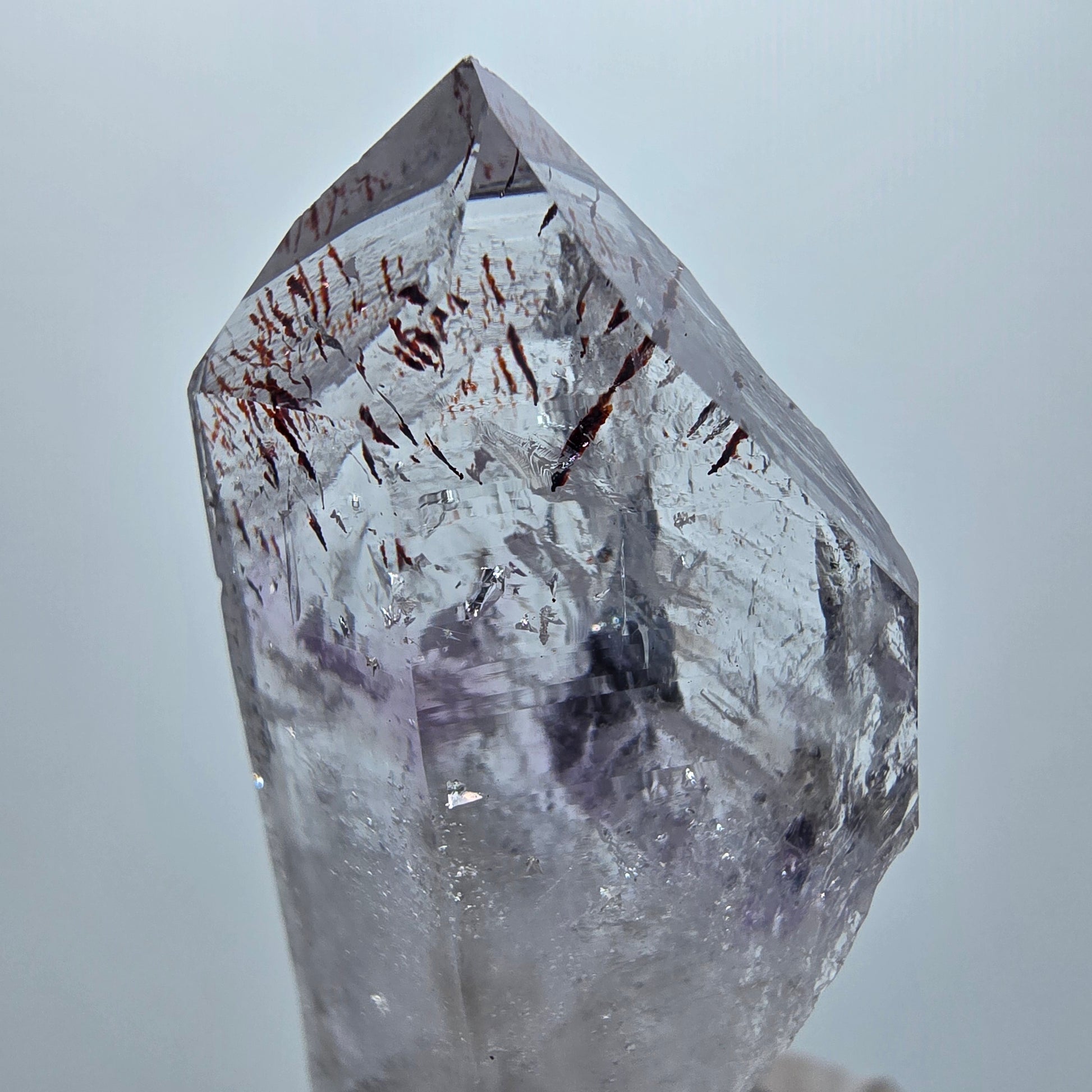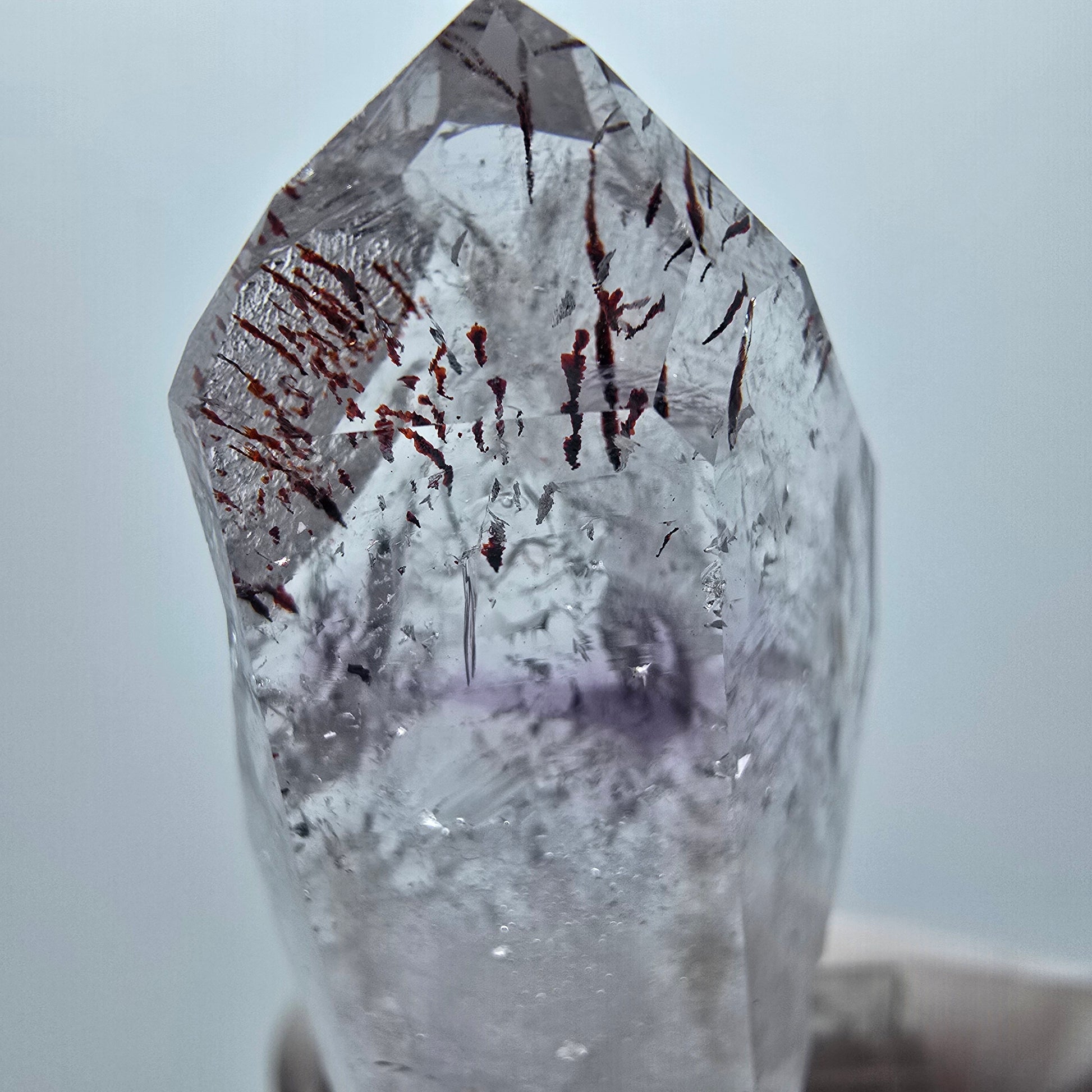 Cette pointe d'améthyste fantôme lémurienne arlequin, provenant de la mine de Streep près de Goboboseb en Namibie, captive par sa rare transparence limpide aux reflets violets et blancs, ses fascinantes inclusions fantômes et ses inclusions d'hématite rouges et noires. La pointe de cristal mesure 46 x 24 x 15 mm et pèse 15 g ; elle présente les rainures horizontales typiques du quartz lémurien.