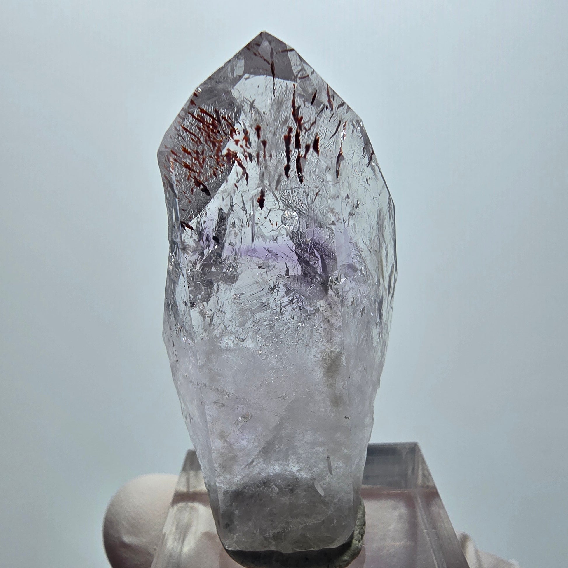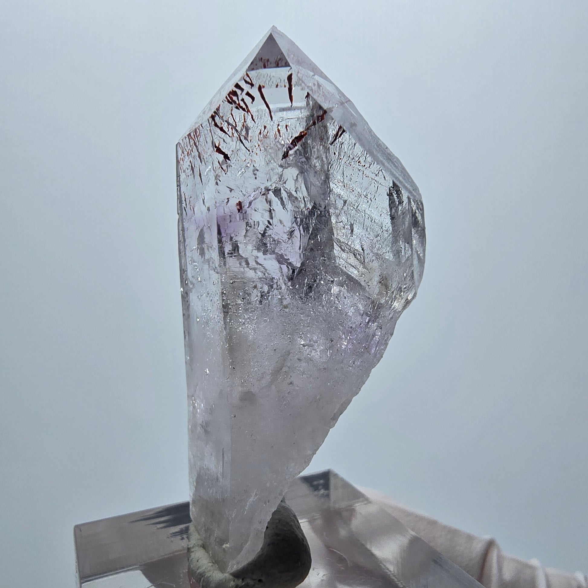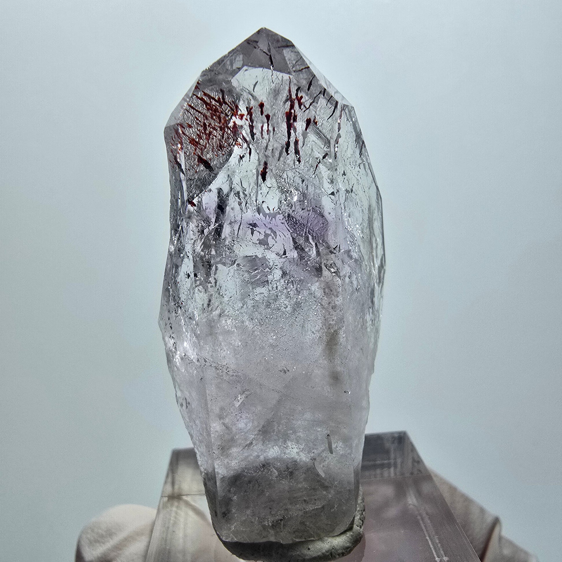 L'association exceptionnelle d'une transparence limpide, de formations fantômes internes et d'inclusions d'hématite colorée fait de cette pièce un objet de collection de grande qualité.