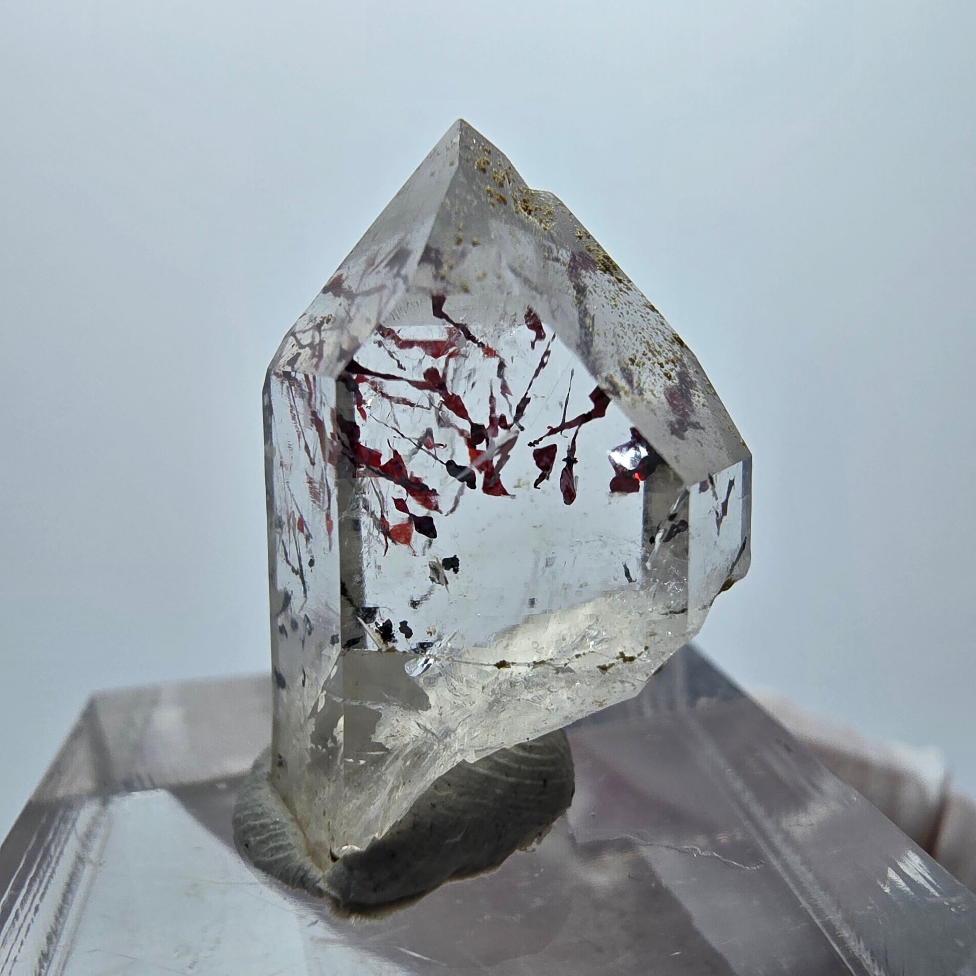Cette rare pointe de quartz fantôme lémurien à motif arlequin, provenant de la mine de Streep en Namibie, est un cristal de quartz blanc transparent et limpide, orné de fascinants fantômes et d'inclusions d'hématite rouge et noire remarquables. Les rainures horizontales en surface, caractéristiques du quartz lémurien, sont typiques.