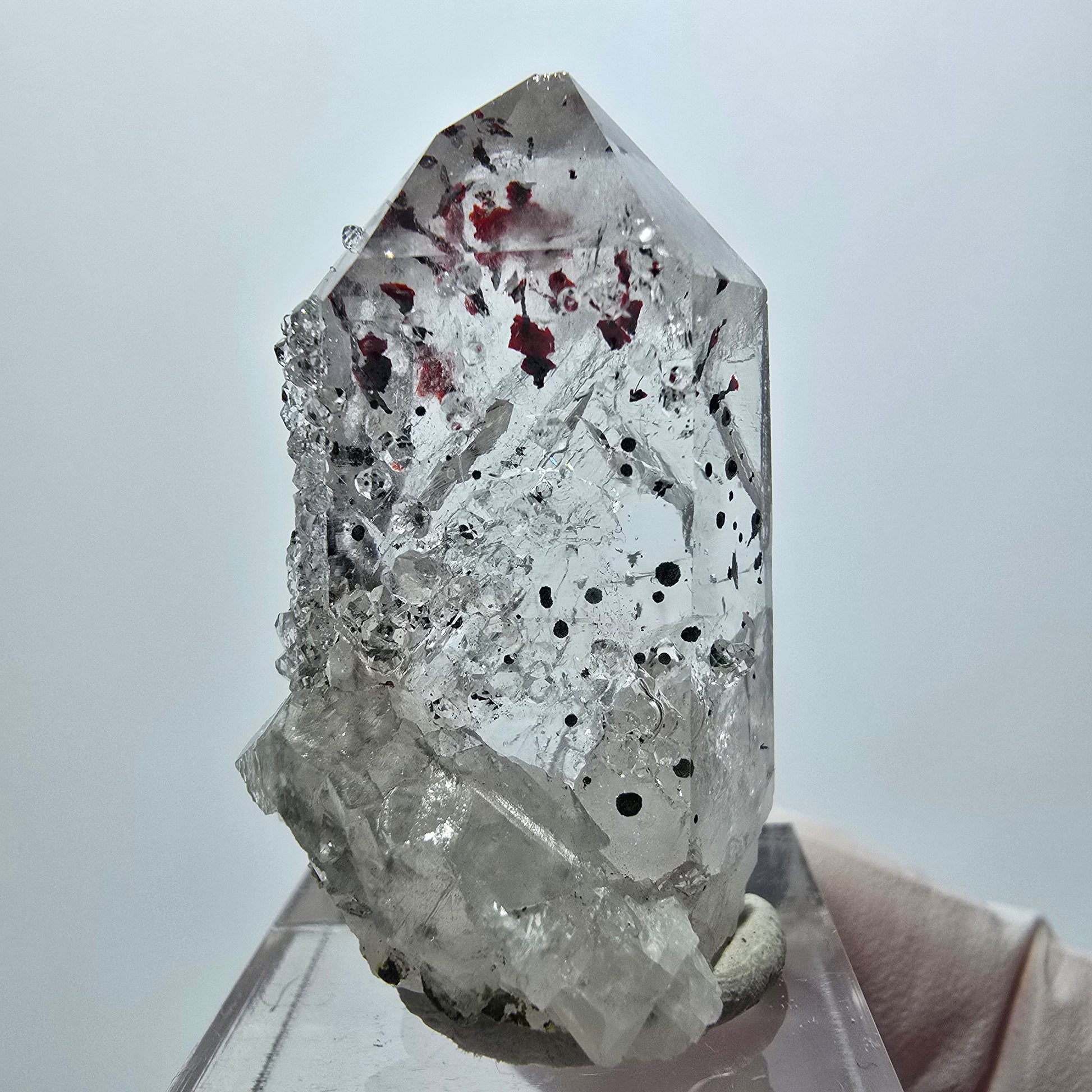 Cette améthyste fantôme arlequin provient de la rare mine de Streep à Goboboseb, en Namibie. La pointe de cristal transparente, d'un blanc violacé limpide, révèle d'impressionnants fantômes internes, ainsi que des inclusions d'hématite rouge et noire.