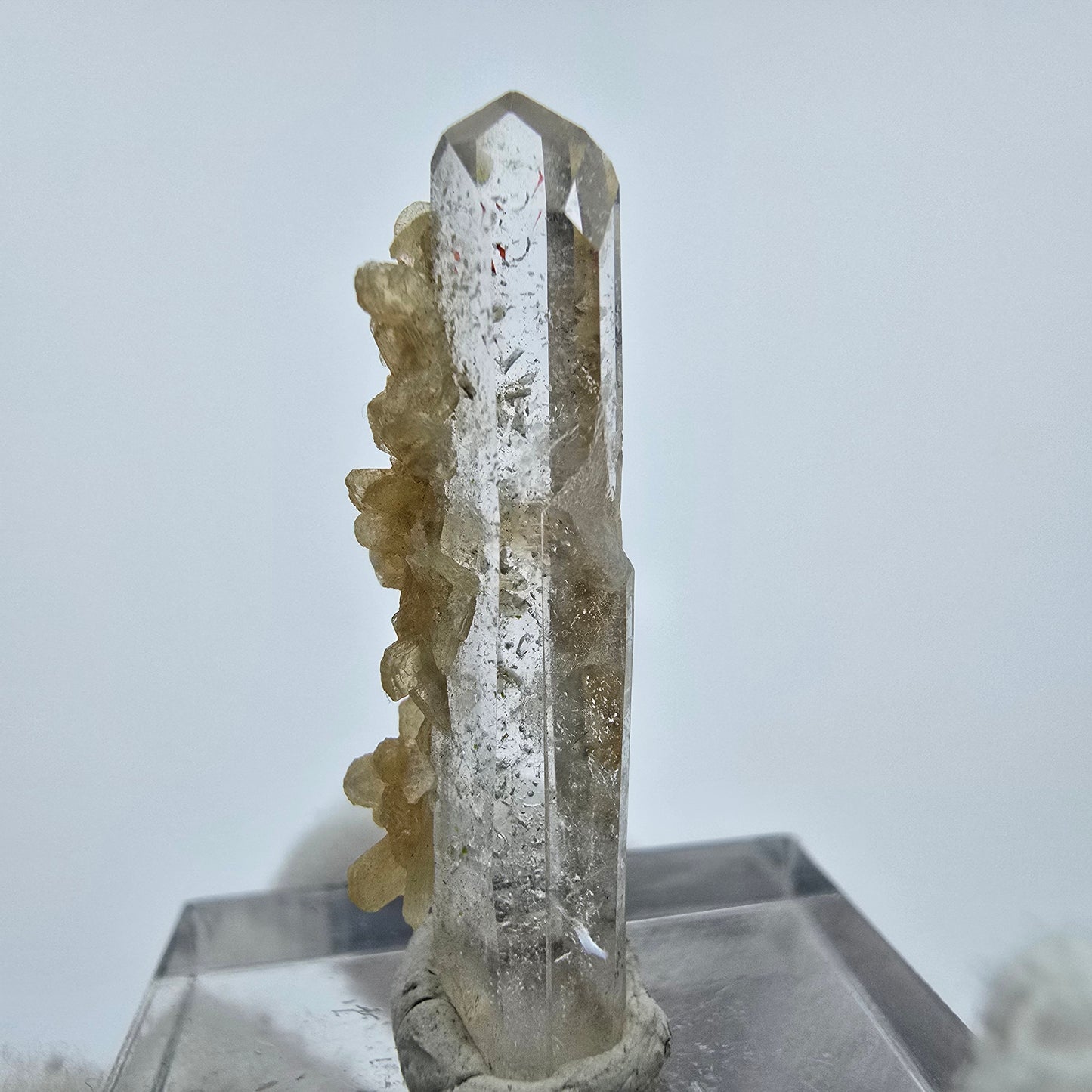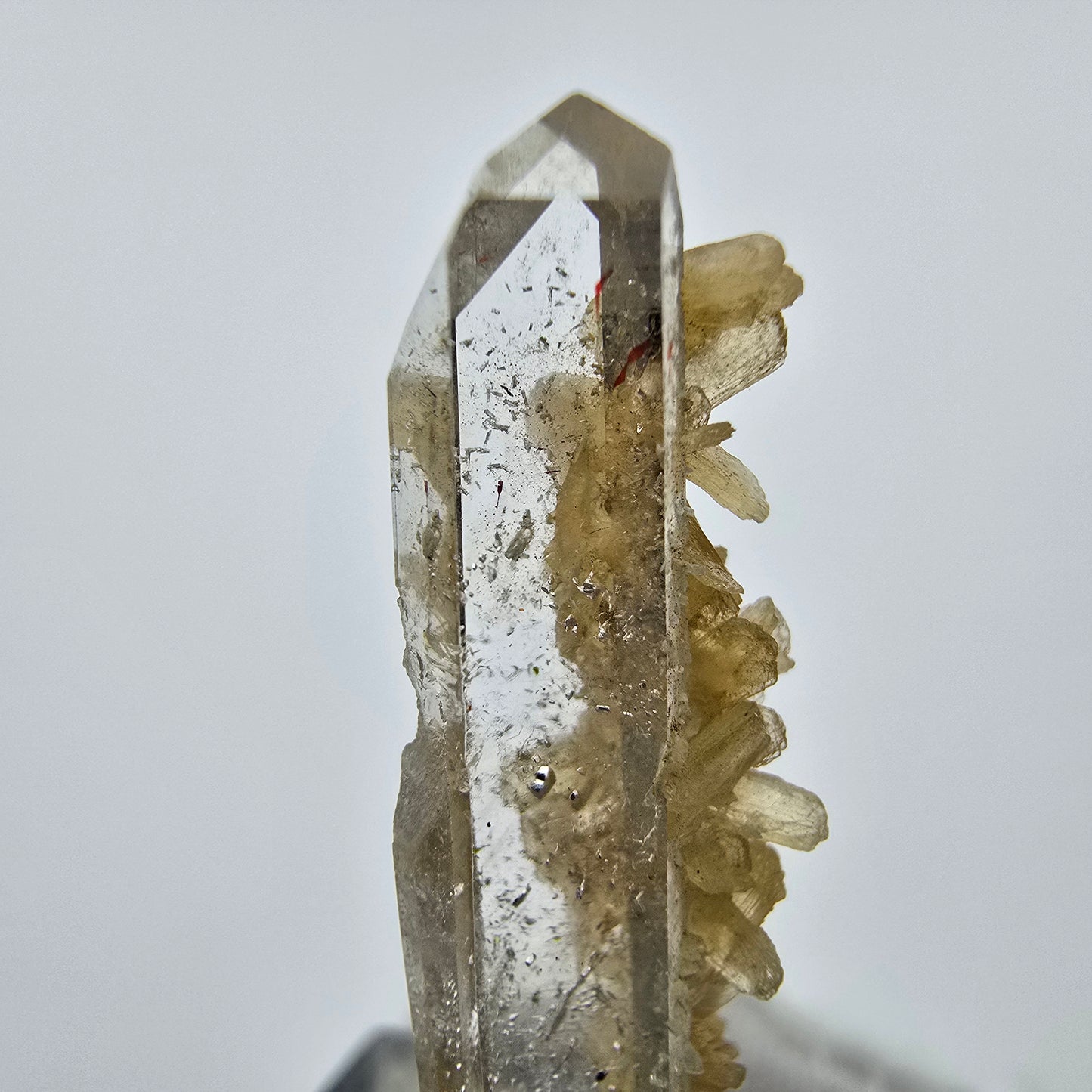 Découvrez ce rare cristal de quartz fumé fantôme avec une fascinante formation cristalline transparente brun-violet. La pointe du cristal présente plusieurs cristaux de stilbite allongés sur un côté, ce qui lui donne une apparence unique. À l'intérieur du cristal, des inclusions d'hématite extraordinaires, rouges et en forme d'aiguilles, sont visibles, qui complètent parfaitement l'image globale.