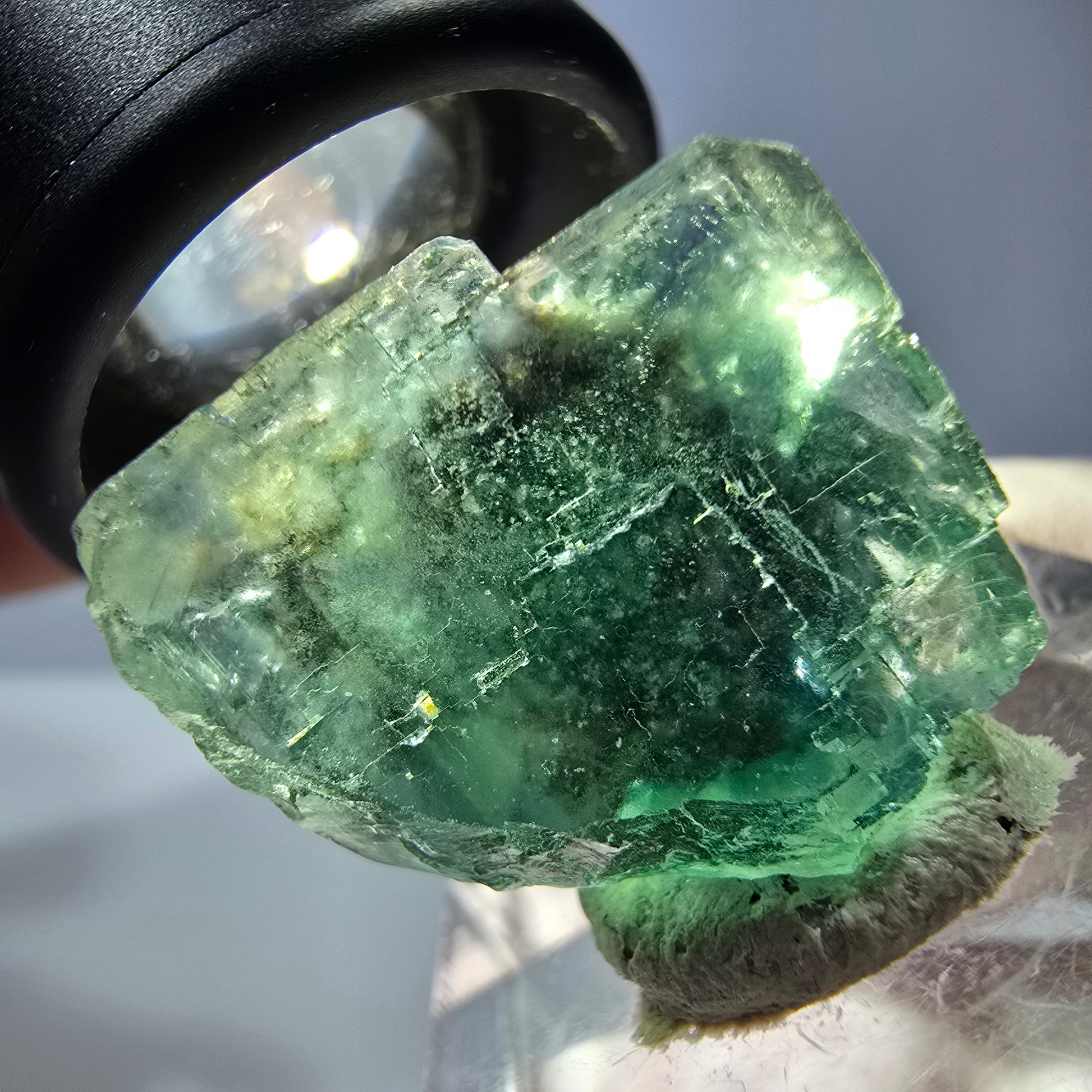 Découvrez notre cube de fluorite fantôme transparent et vert, qui se distingue par sa forme cubique unique et sa surface parquetée attrayante. Ce cristal de fluorite de haute qualité, avec ses magnifiques fantômes cachés à l'intérieur, offre non seulement un attrait visuel particulier, mais aussi une aura énergétique fascinante.