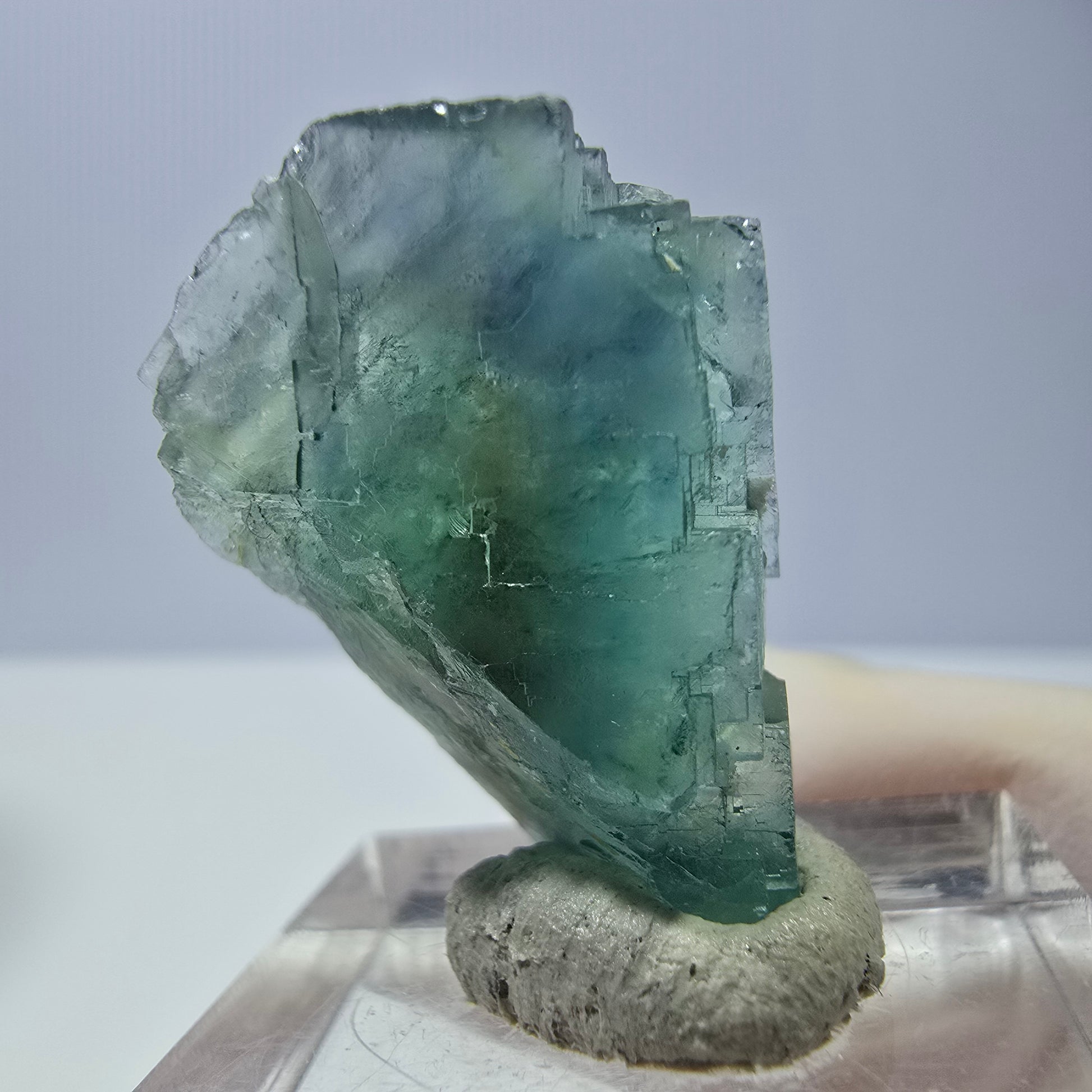 Découvrez notre cristal cubique de fluorite fantôme, clair, vert et transparent. Avec sa forme cubique et sa surface parquetée, ce cristal exquis attire tous les regards. À l'intérieur du cube se cachent des fantômes fascinants qui confèrent à la pierre une beauté unique.