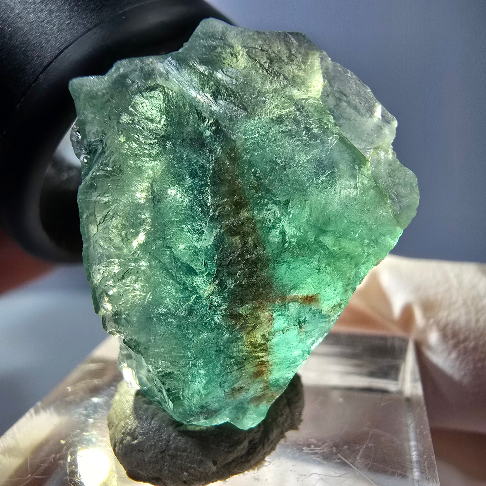 La fluorite mesure 26 x 19 x 16 mm et pèse 8 g. Elle provient d'Okorusu, en Namibie, une région réputée pour ses minéraux de haute qualité.