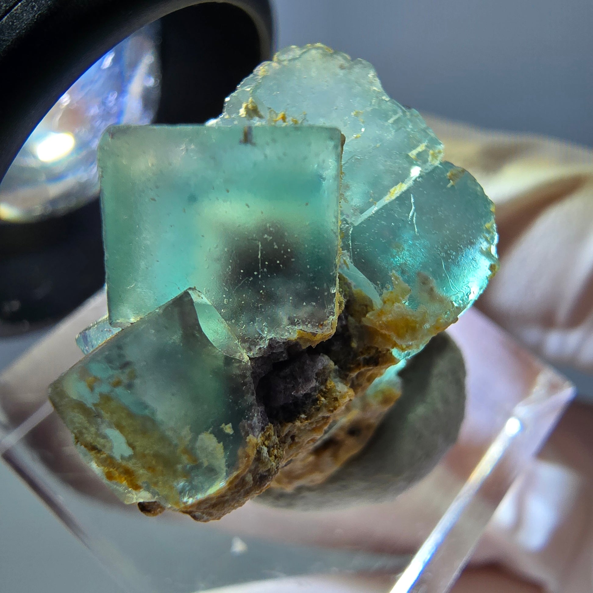 Découvrez notre rare spécimen de Fluorite Fantôme Cube, dont les cristaux cubiques transparents vert-transparents recèlent de fascinants fantômes. Ces minéraux exquis sont non seulement un véritable accroche-regard, mais aussi une merveilleuse pièce de collection. La surface partiellement parquetée confère au spécimen un caractère unique et met en valeur la beauté de la fluorite.