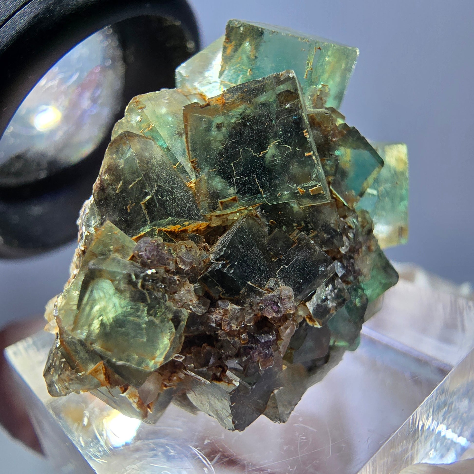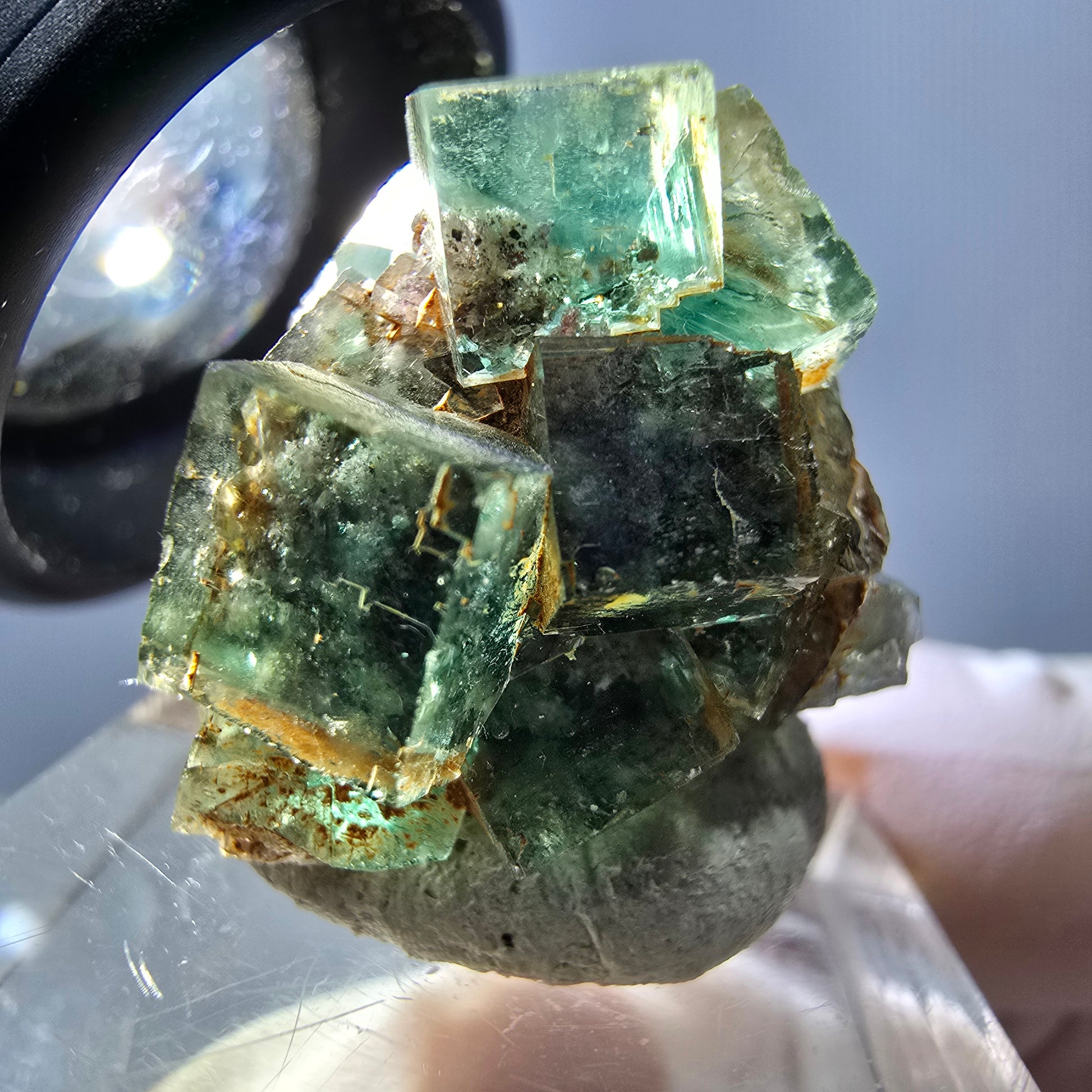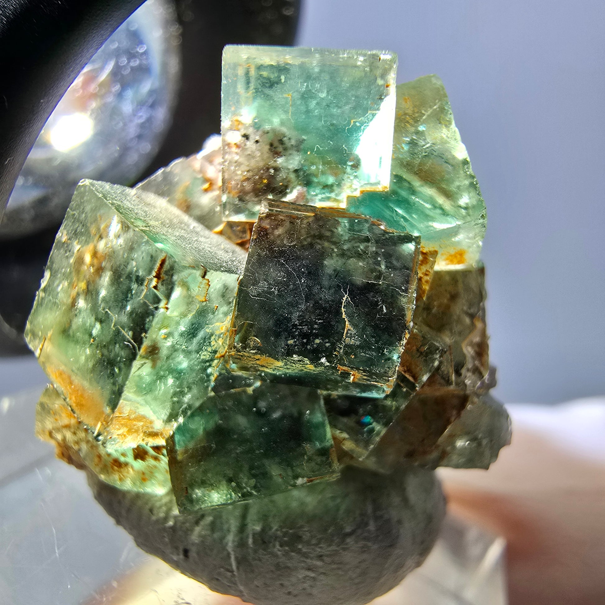 Découvrez notre rare spécimen de fluorite fantôme cubique, qui séduit par ses cristaux cubiques transparents d'un vert profond. Ces cristaux présentent d'impressionnants fantômes visibles à l'intérieur des cubes. Cette structure unique, associée à une surface partiellement parquetée, fait de cette fluorite un véritable objet de collection et un véritable accroche-regard.
