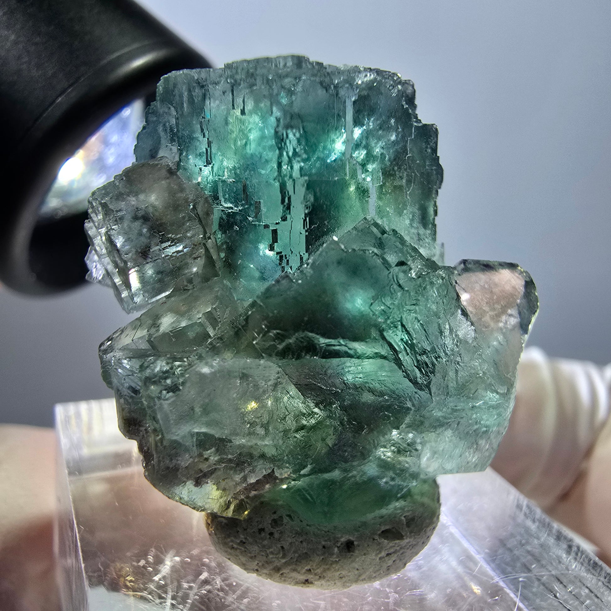 Découvrez ce rare spécimen cubique de fluorite, composé de fascinants cristaux cubiques, limpides, vert-transparents, abritant de magnifiques fantômes. Sa surface partiellement parquetée lui confère un aspect unique et attrayant.