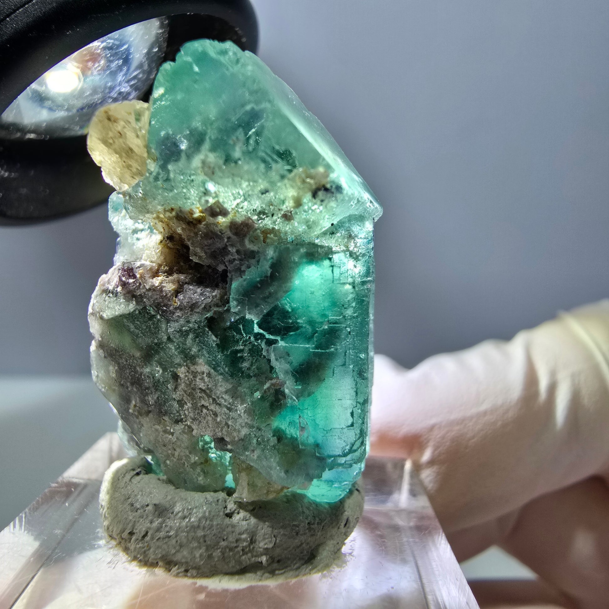 Découvrez notre rare spécimen de Fluorite Fantôme Cube, d'un vert éclatant. Ce cristal exquis présente des cristaux cubiques transparents, vert-transparents, entrecoupés de magnifiques fantômes. Sa surface partiellement parquetée lui confère un caractère unique. Idéal pour les collectionneurs et les amateurs de minéraux rares.