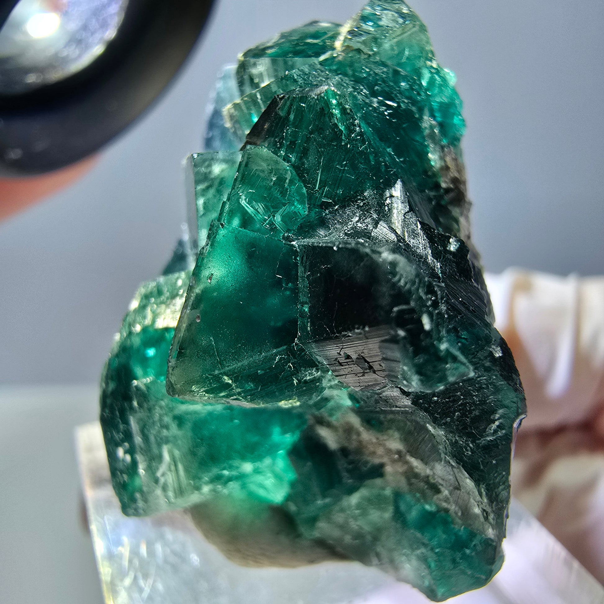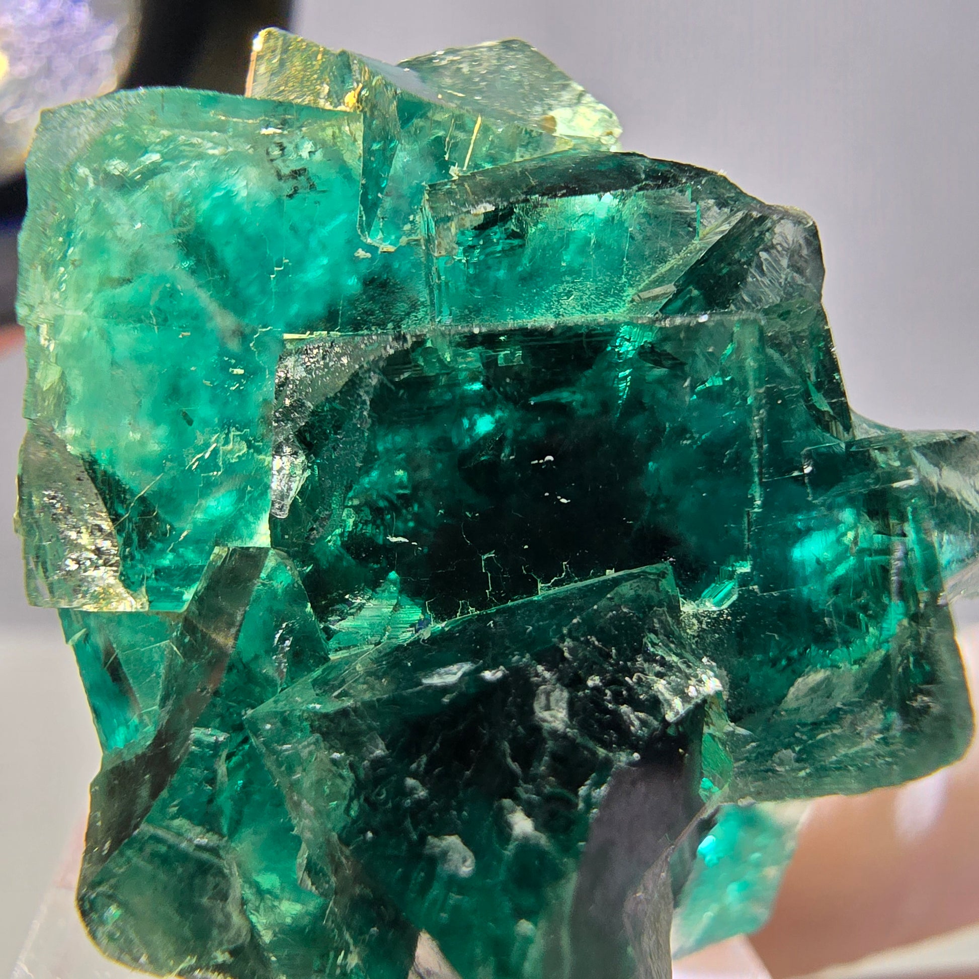 Découvrez notre magnifique spécimen de Fluorite Fantôme Cube, un cristal rare et enchanteur aux formes cubiques transparentes et vert-transparentes. Chaque pièce présente d'impressionnants fantômes, conférant au minéral une profondeur unique et fascinante. Sa surface partiellement parquetée offre également un attrait visuel supplémentaire, faisant de cette fluorite un véritable accroche-regard.