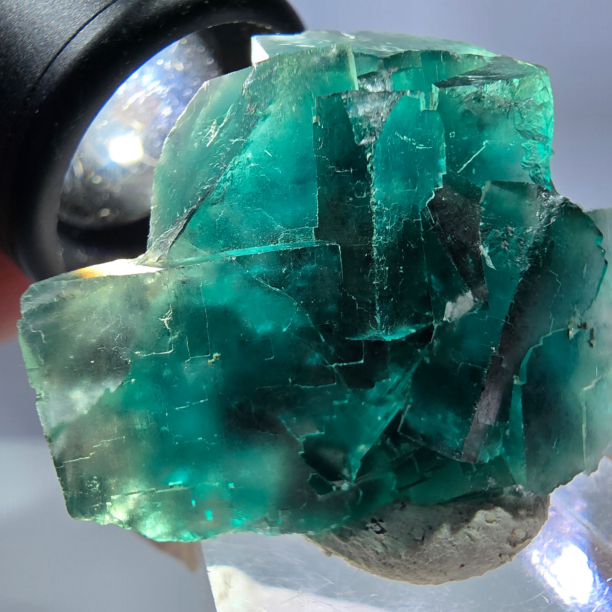 Découvrez ce rare et fascinant spécimen de cube de fluorite fantôme, qui séduit par ses cristaux cubiques transparents d'un vert transparent. Avec ses magnifiques fantômes ornant l'intérieur du cristal et sa surface partiellement parquetée, ce spécimen est une véritable pièce de collection. Chaque détail de sa structure raconte une histoire unique d'art minéral.