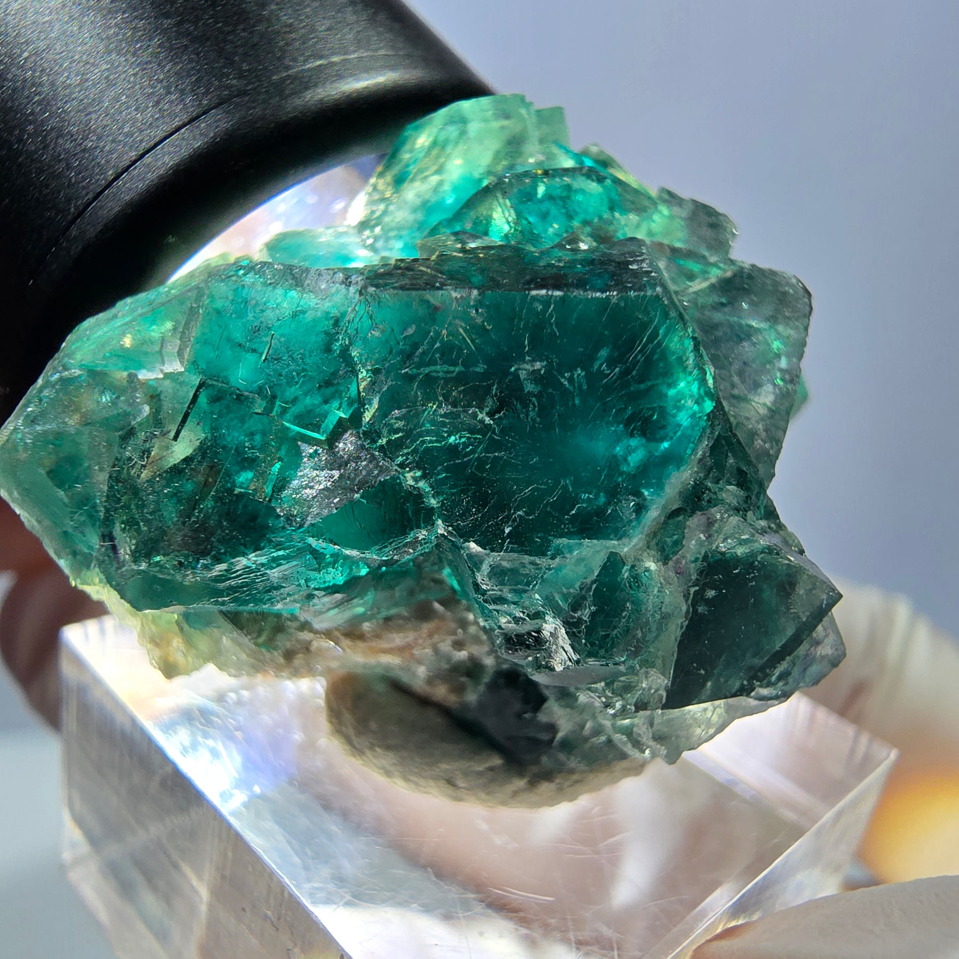 Découvrez la beauté et la rareté du spécimen de cube de fluorite fantôme d'Okorusu, en Namibie. Ces magnifiques cristaux cubiques, clairs et vert-transparents, captivent par leurs fascinants fantômes, qui leur confèrent un caractère unique. Avec sa surface partiellement parquetée, chaque cube est non seulement une pièce de collection fascinante, mais aussi une œuvre d'art naturelle véritablement admirée.