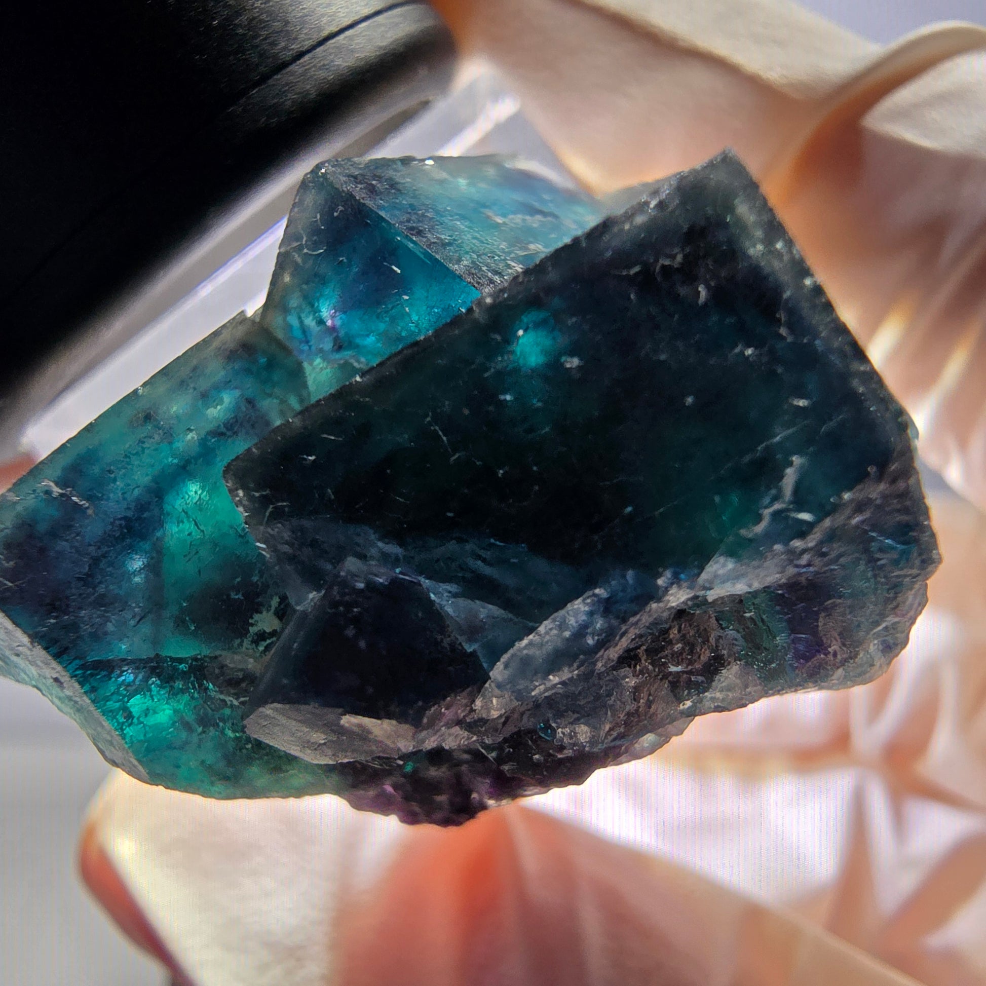 Découvrez notre magnifique spécimen de cube de fluorite fantôme, décliné dans une palette captivante de violet et de bleu. Ce cristal rare se caractérise par sa transparence, entrelacée de superbes motifs fantômes verts et violets. Chaque facette du cube semble refléter la lumière de manière unique, offrant une expérience visuelle fascinante.