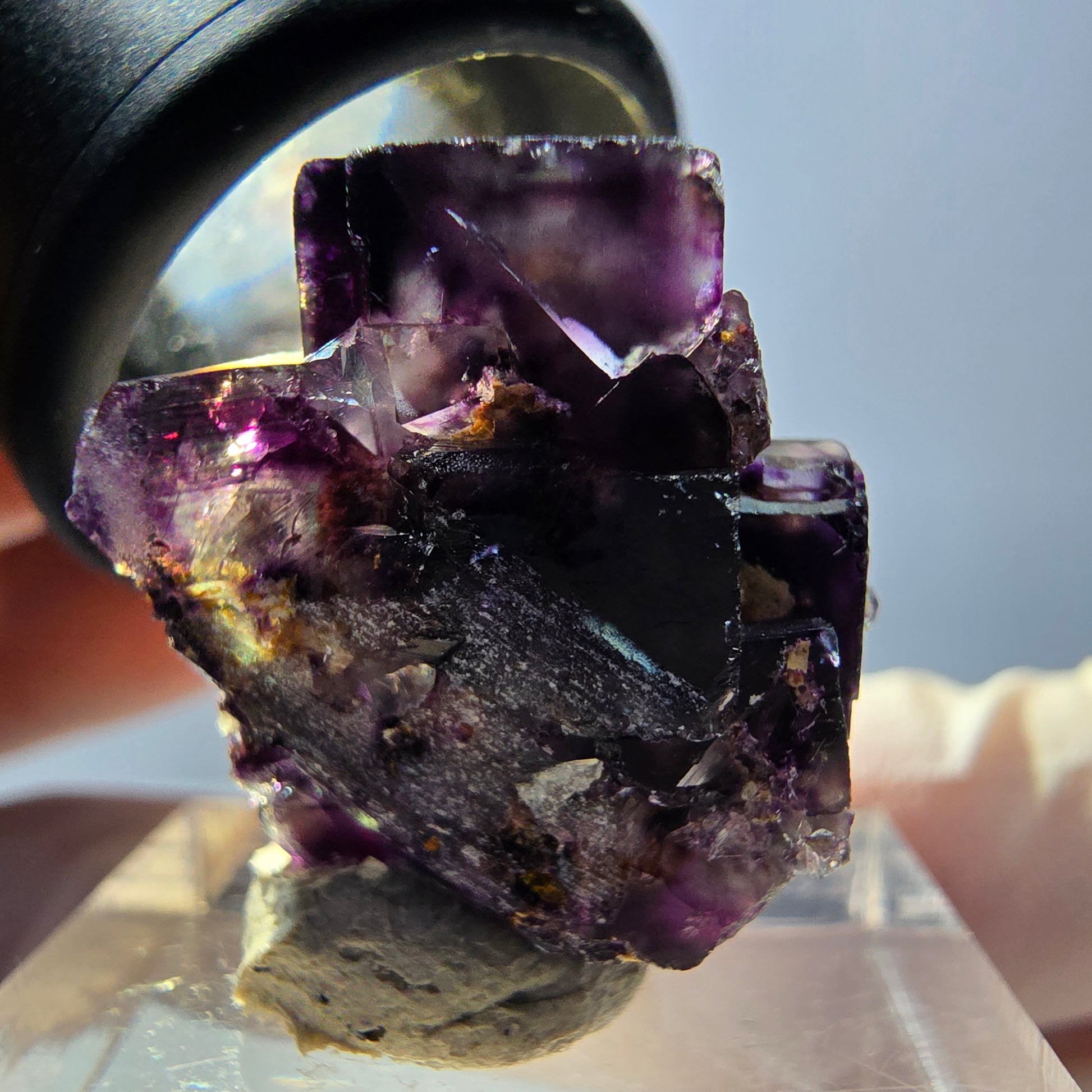Découvrez ce spécimen unique de cube de fluorite fantôme, aux reflets verts et violets enchanteurs. Ce rare spécimen de fluorite parquetée présente des cubes d'une clarté et d'une transparence saisissantes, ornés de fantômes fascinants. Mesurant 22 mm x 20 mm x 14 mm et pesant seulement 9 g, ce spécimen est à la fois un ajout exceptionnel à la collection de tout amateur de minéraux et une pièce de collection idéale. Cette œuvre d'art de la nature a été découverte à Okorusu, en Namibie.