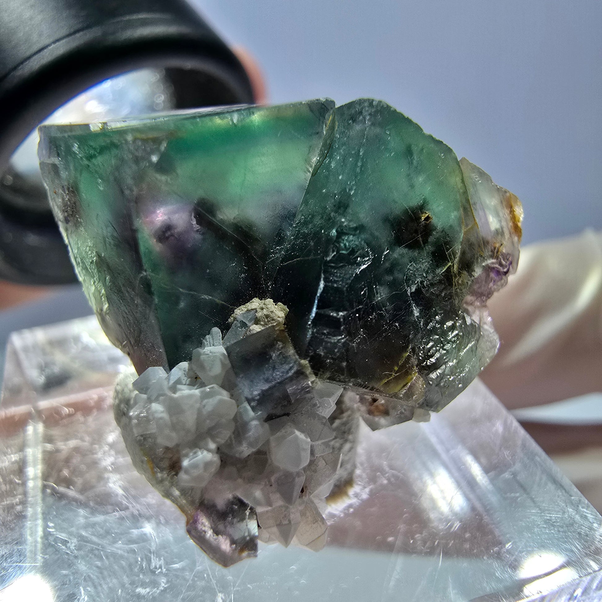 Découvrez notre magnifique spécimen d'un rare cube de fluorite transparent vert-violet. Cette acquisition unique présente de magnifiques cristaux cubiques en parqueterie abritant d'intrigants fantômes. Les acheteurs peuvent s'attendre à une expérience visuelle exceptionnelle !