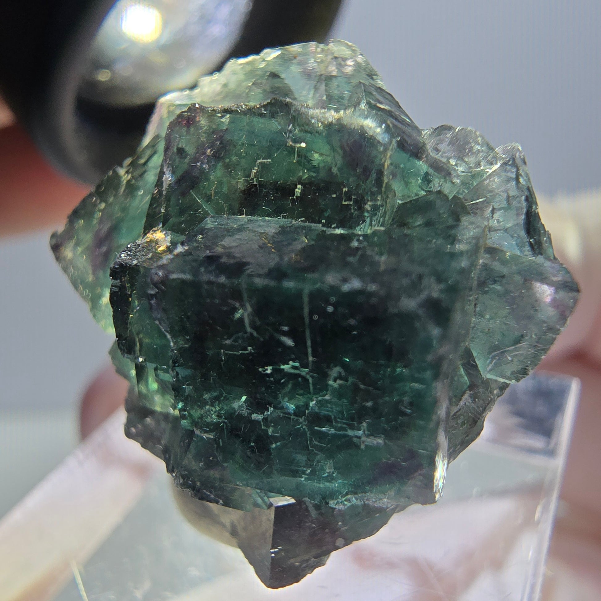 - Rare spécimen de cube de fluorite parqueté transparent vert-violet