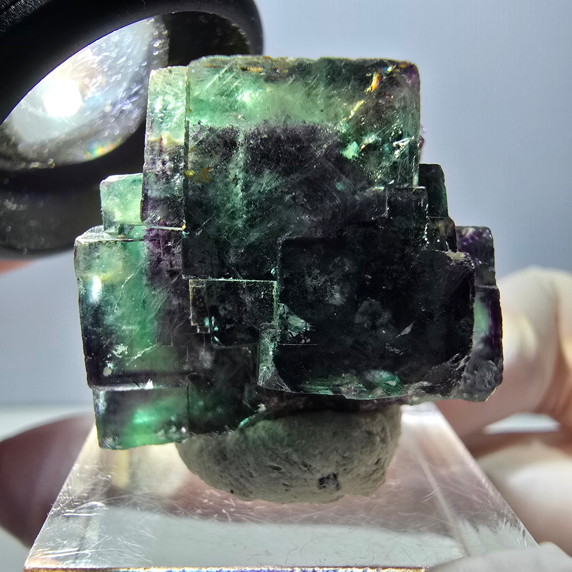 Découvrez nos rares spécimens de fluorite cubique parquetée, vert-violet transparent, aux impressionnants cristaux cubiques. Cette pièce exquise, aux reflets fantomatiques saisissants, représente une véritable œuvre de la nature avec sa composition chromatique unique.