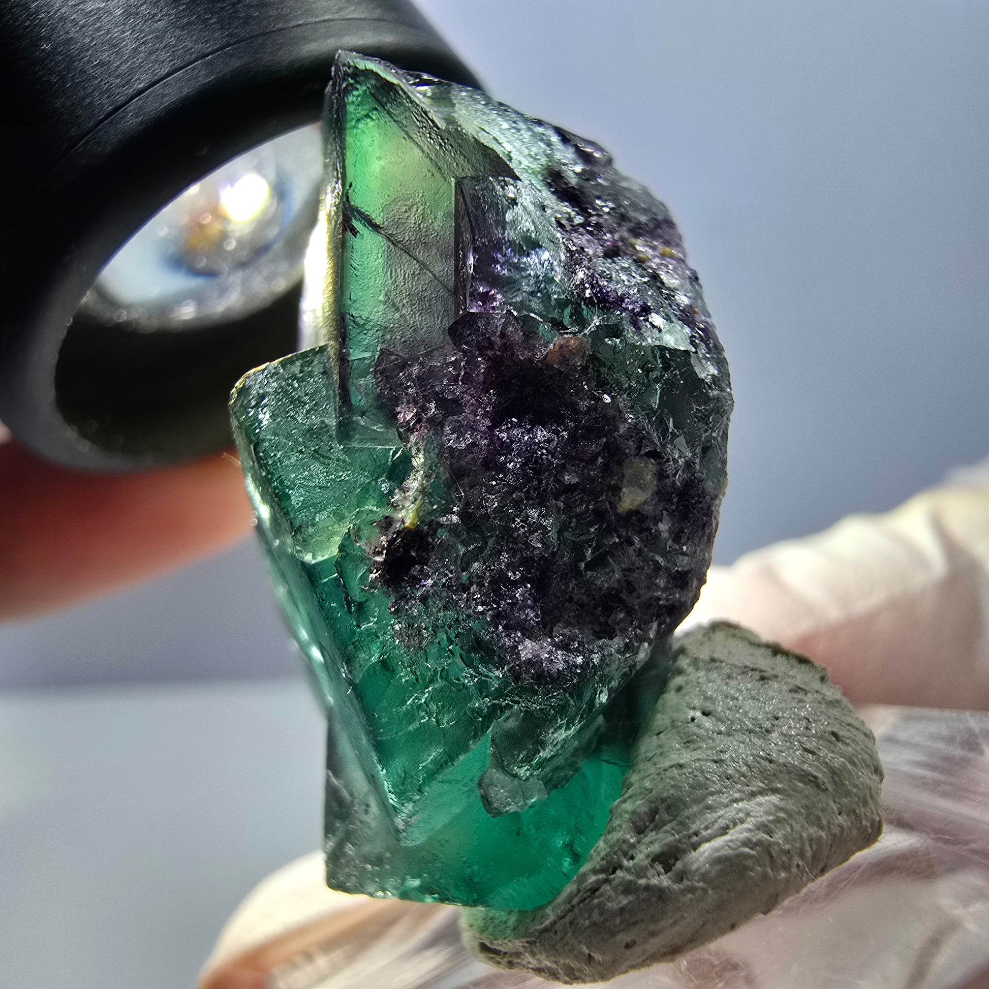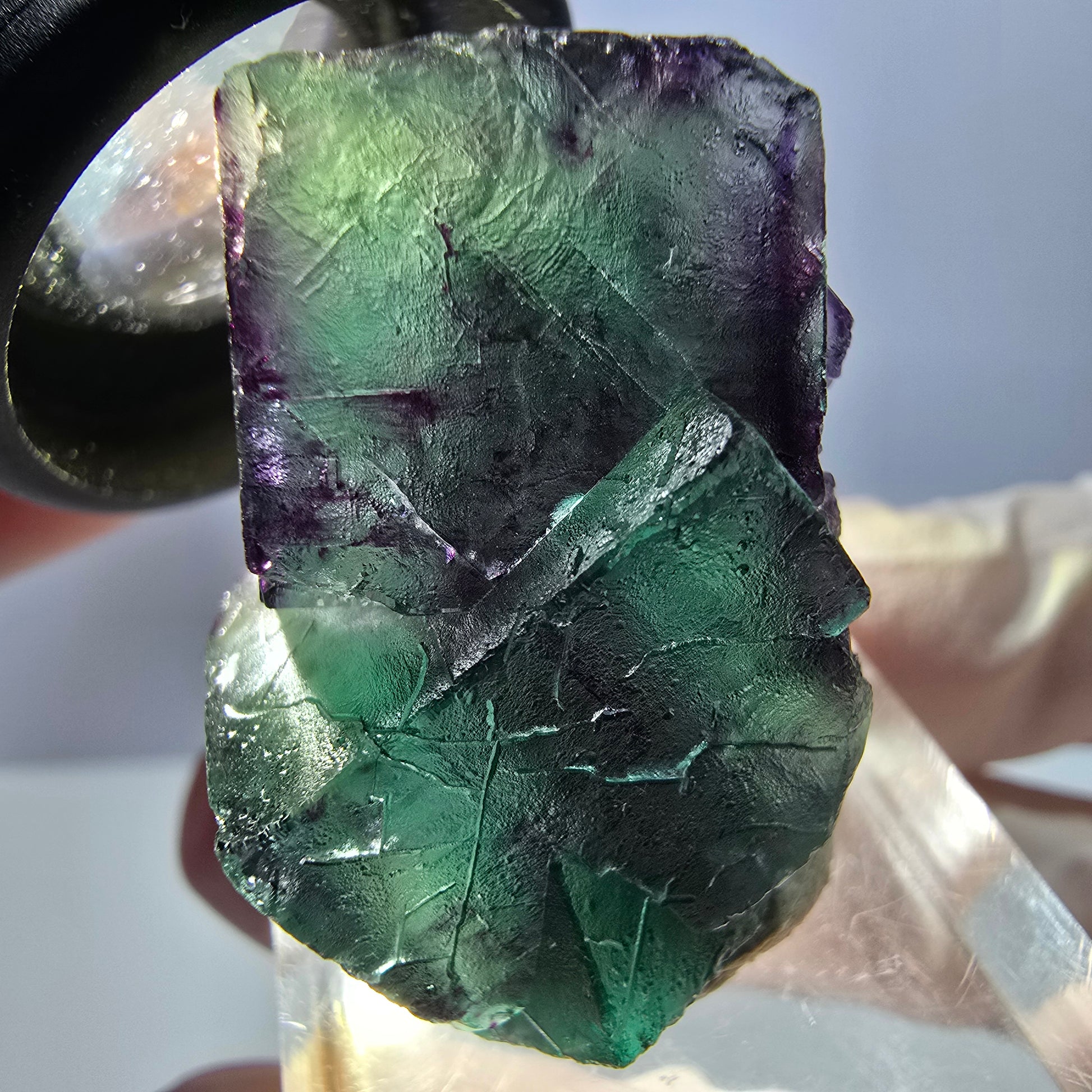 Nous vous présentons un rare cube de fluorite parqueté provenant du fascinant site d'Okorusu, en Namibie. Ce magnifique cristal se caractérise par sa couleur vert-violet transparent et est connu pour ses impressionnants fantômes. Ces cristaux cubiques parquetés créent un jeu harmonieux de lumière et de couleurs qui fera la fierté de tout collectionneur de cristaux, qu'il soit virtuel ou réel.
