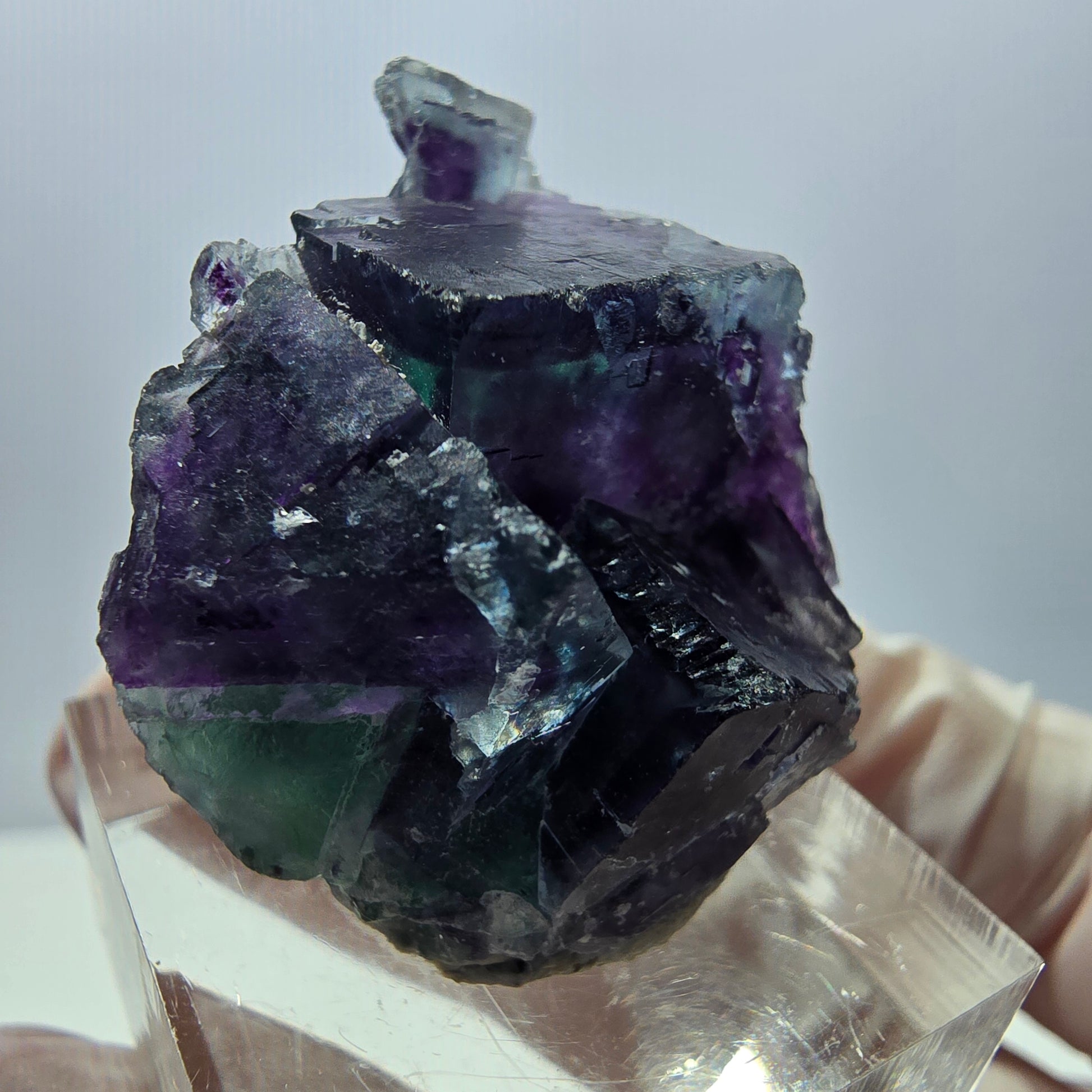 Découvrez cet extraordinaire spécimen de cube de fluorite parqueté, rayonnant d'une fascinante combinaison de teintes vertes et violettes. Ce spécimen rare se distingue par ses fascinants fantômes au sein de sa structure cristalline.