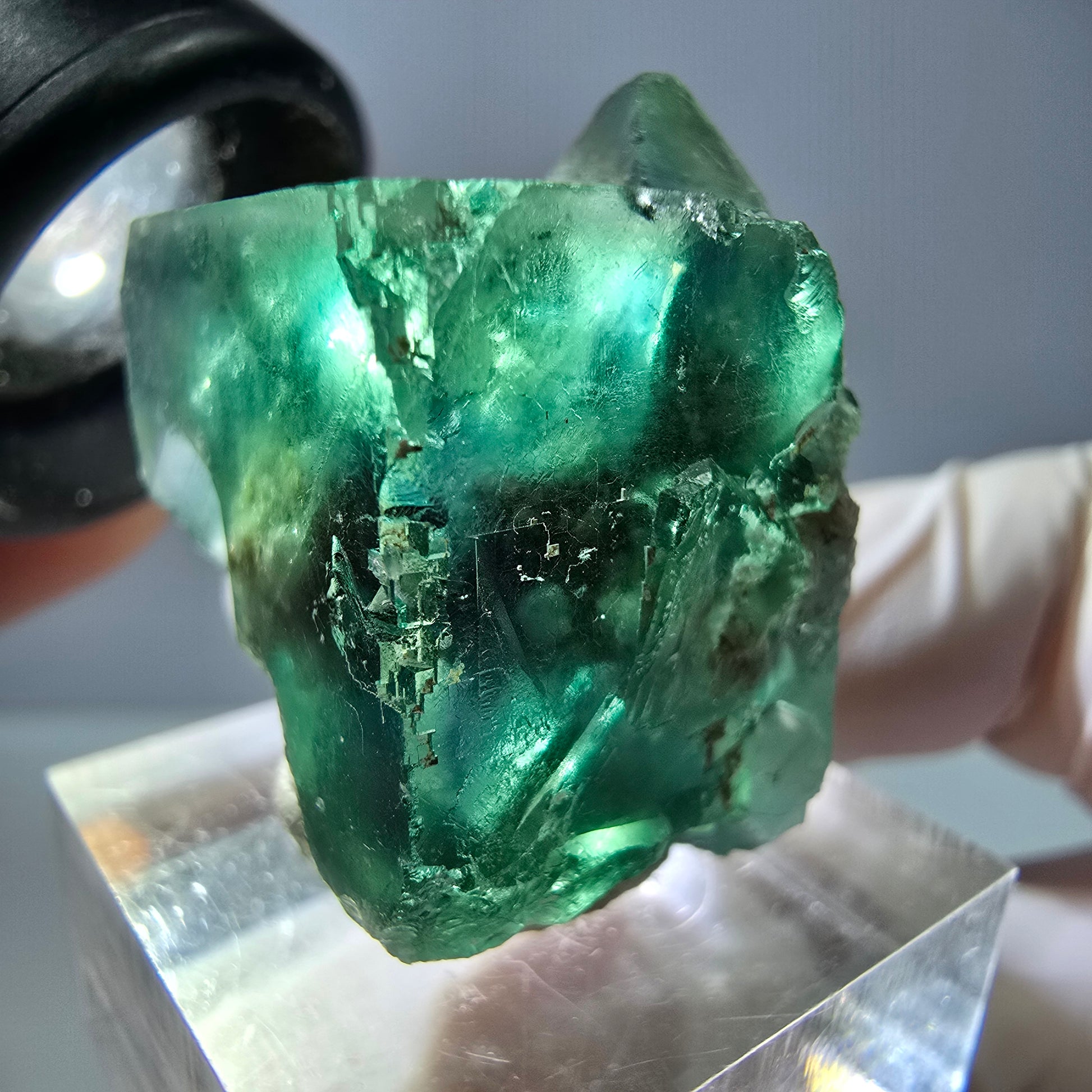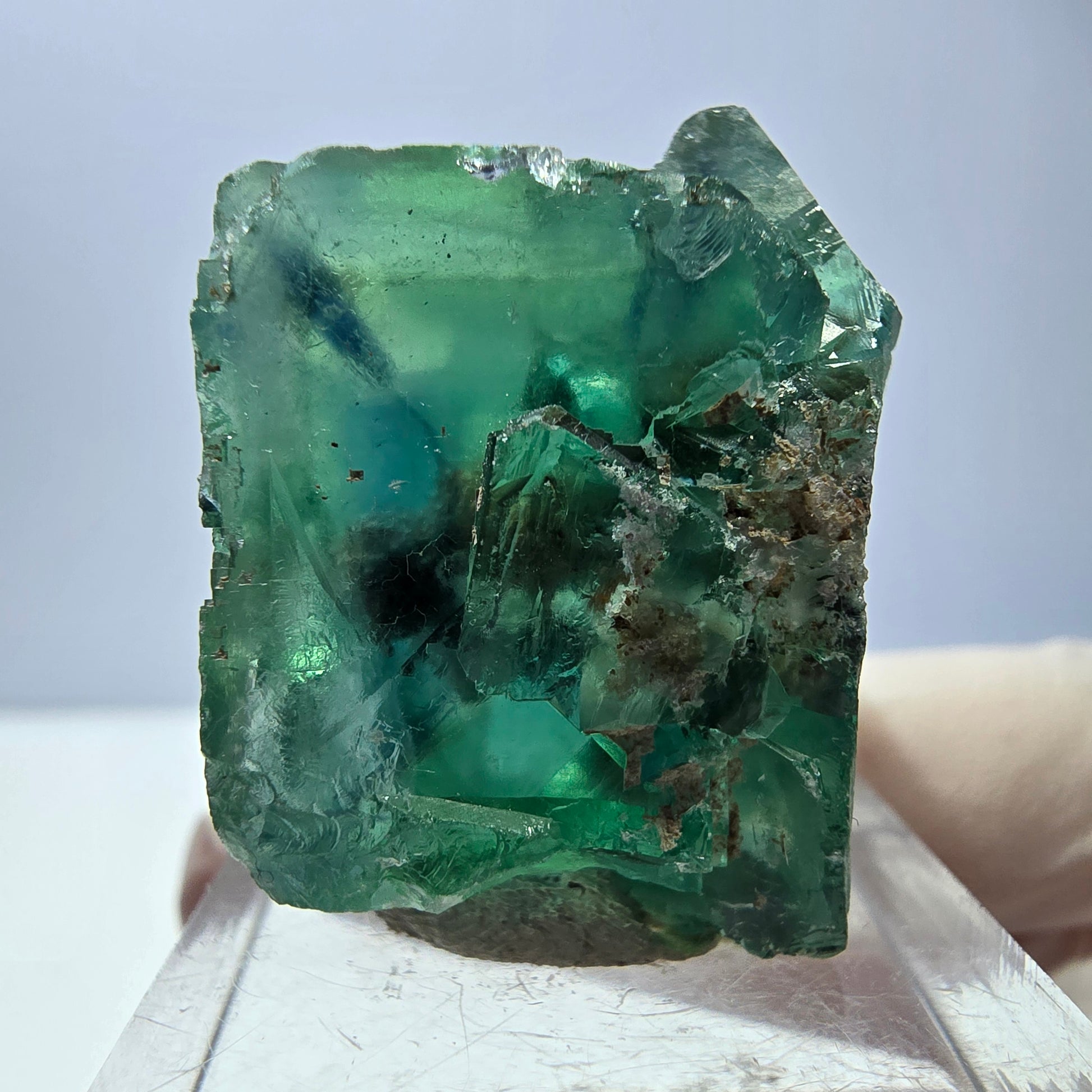 Découvrez ce rare cube de fluorite verte et transparente, caractérisé par ses impressionnants cristaux cubiques en parquet. Chaque cristal recèle de magnifiques fantômes qui réfractent la lumière de manière fascinante. Mesurant 30 x 29 x 24 mm et pesant 31 g, cette pièce est non seulement un véritable accroche-regard, mais aussi un superbe objet de collection pour les amateurs de minéraux.