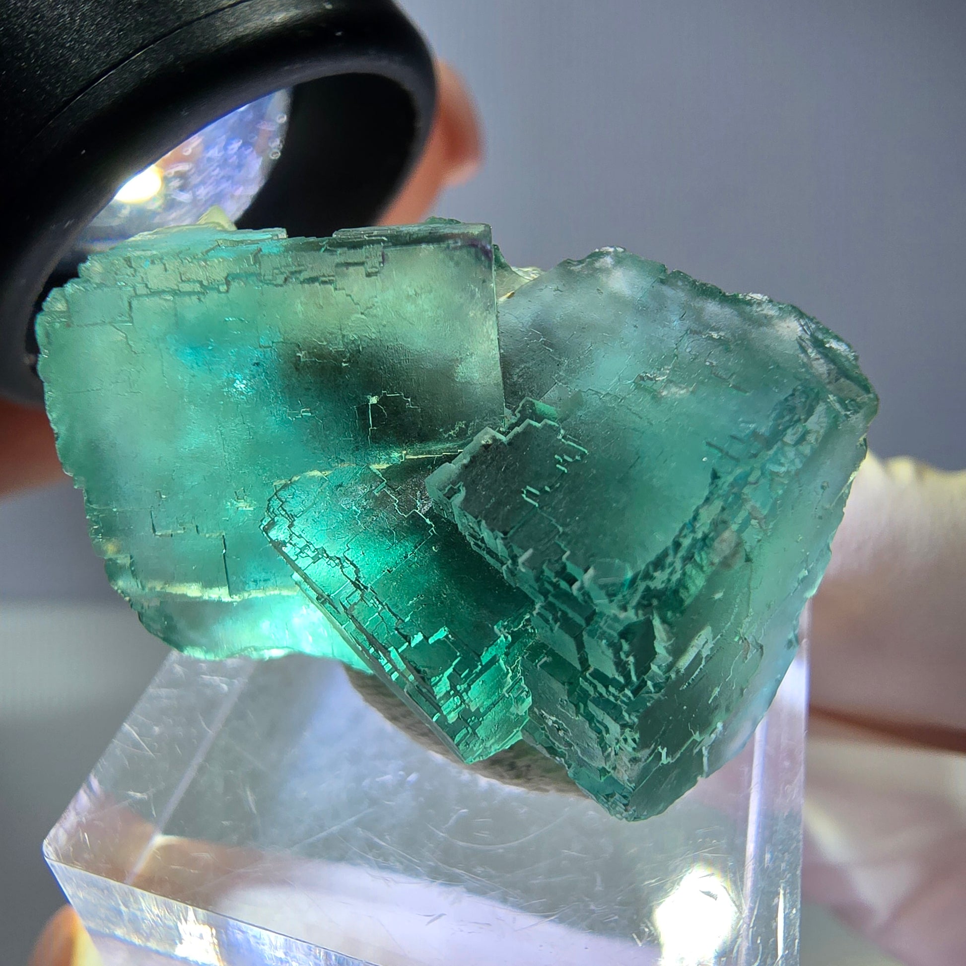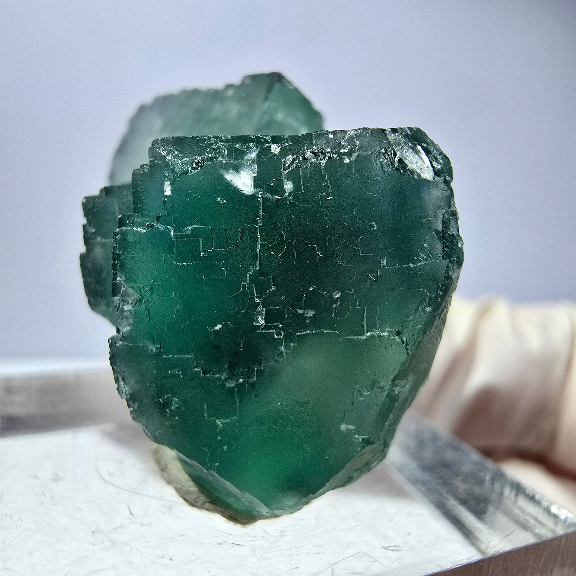 Découvrez la beauté envoûtante du cube de fluorite fantôme ! Ce rare spécimen de cube de fluorite vert-transparent impressionne par ses cristaux magnifiquement formés, cubiques et parquetés, qui renferment d'impressionnants fantômes. Originaire de la localité namibienne d'Okorusu, cette fluorite est un exemple exceptionnel de la diversité minéralogique de cette région.