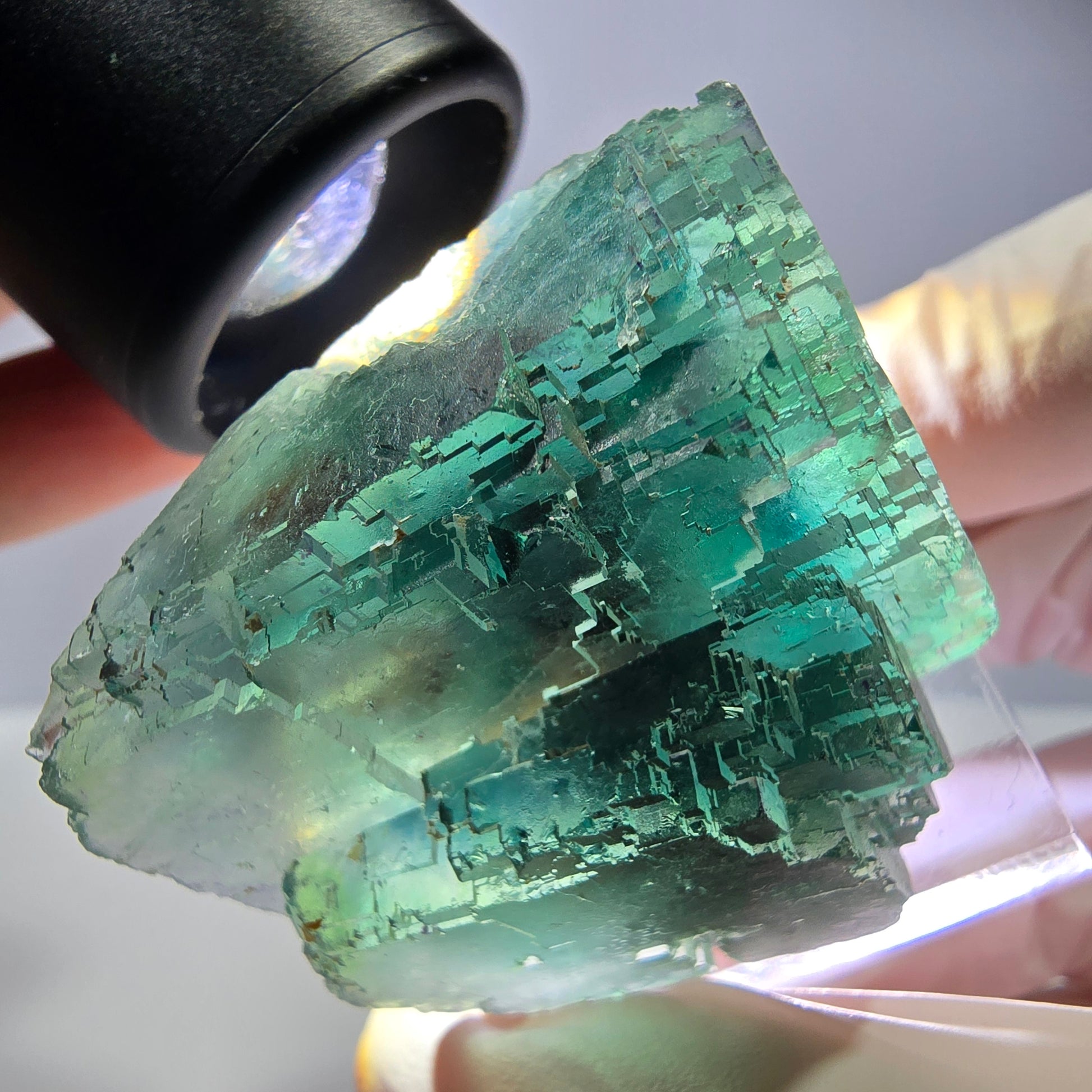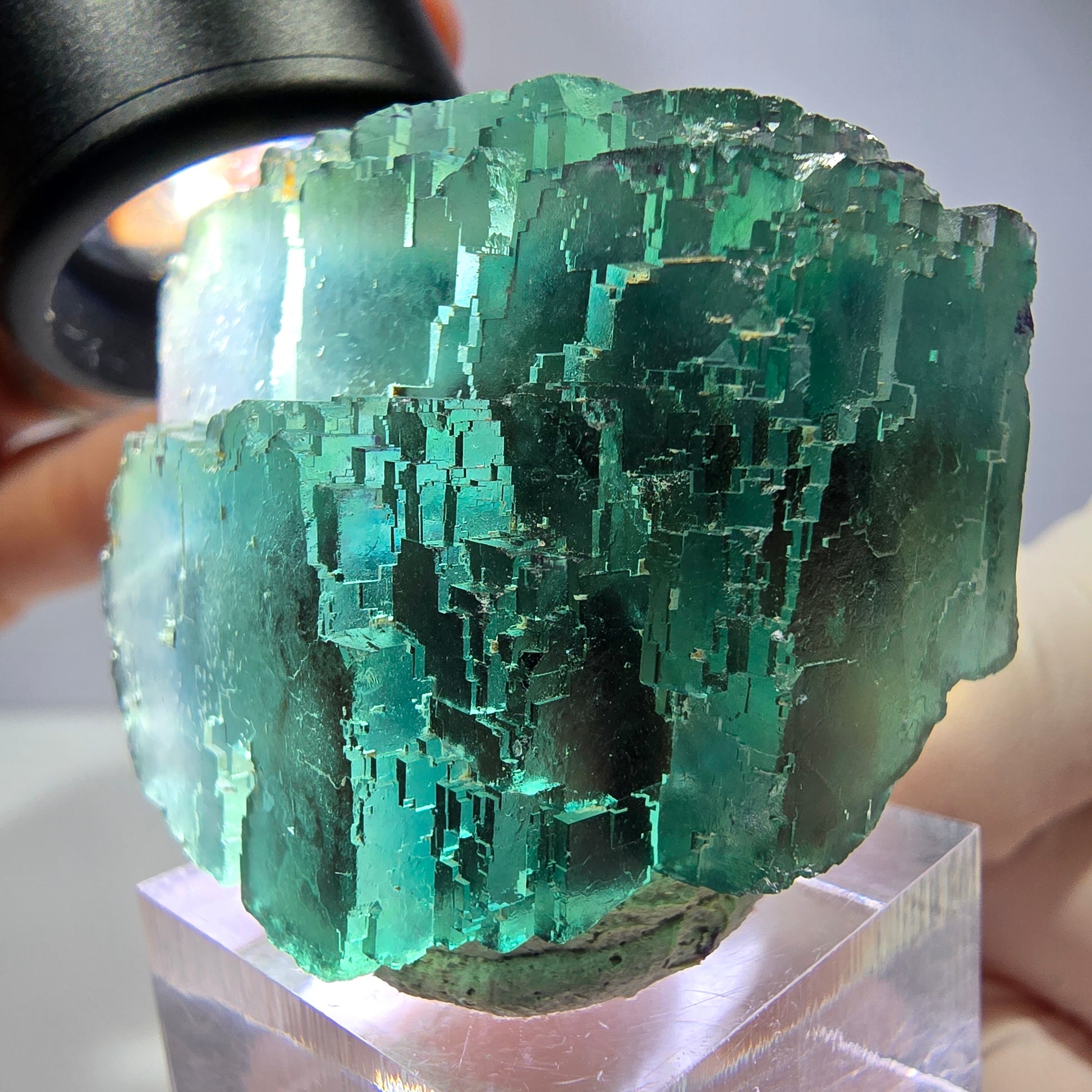 Découvrez notre rare spécimen cubique de fluorite verte et transparente d'Okorusu, en Namibie. Avec ses cristaux cubiques et parquetés uniques, cette fluorite, ornée d'impressionnants fantômes, ne manquera pas d'attirer l'attention.