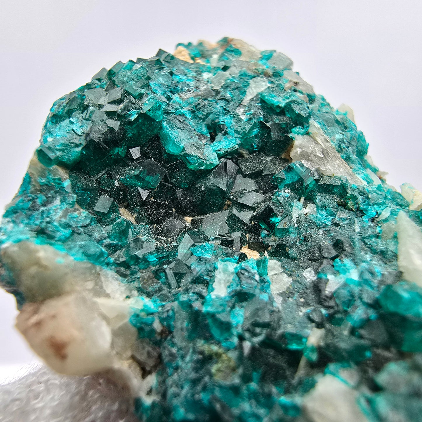 Nous vous présentons un spécimen minéral exceptionnel et rare : l'association d'une élégante dioptase et d'un quartz étincelant. Ce spécimen impressionne par ses cristaux de dioptase allongés, partiellement transparents, de couleur turquoise foncé et brillants, qui reposent sur une matrice de cristaux de quartz blanc. La composition harmonieuse des couleurs et la structure intéressante font de cette pièce un point fort pour les collectionneurs et les amateurs de minéraux.