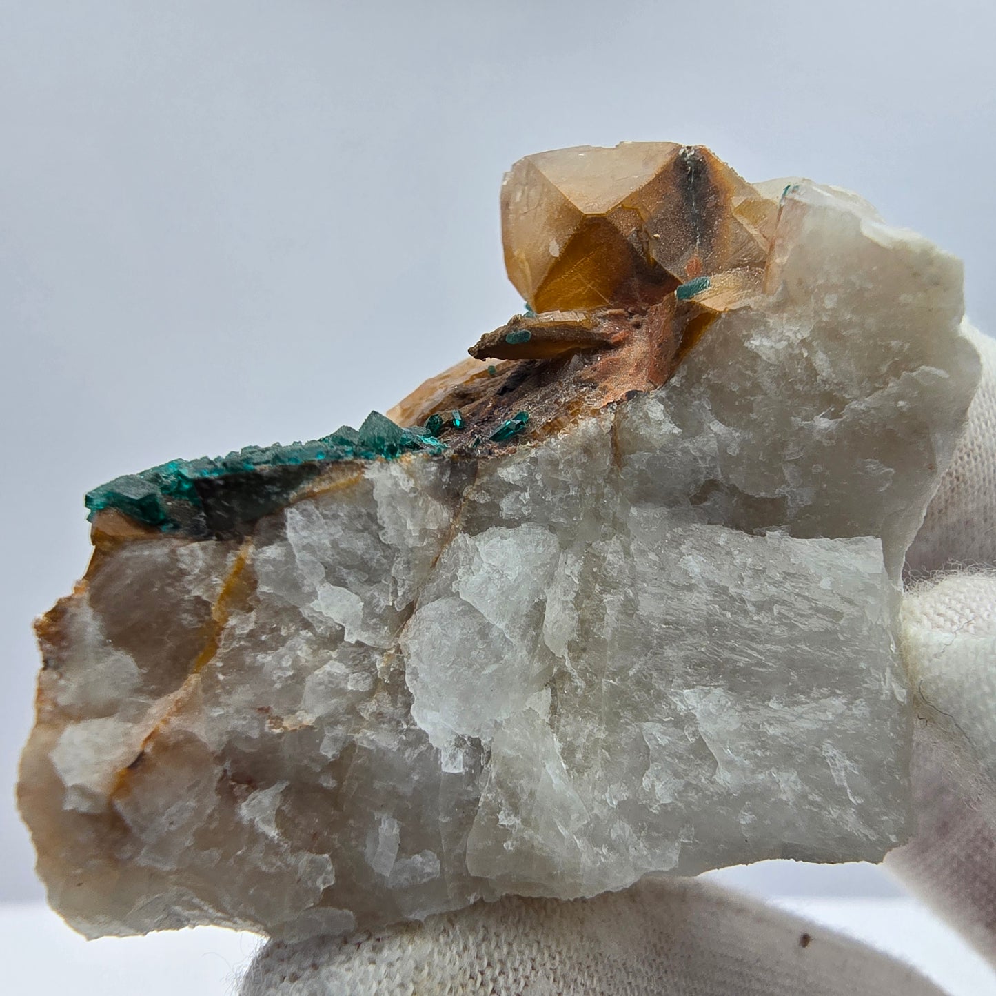 Rare spécimen de dioptase sur quartz Kaokoveld, Namibie 40*36*26mm Collection de minéraux