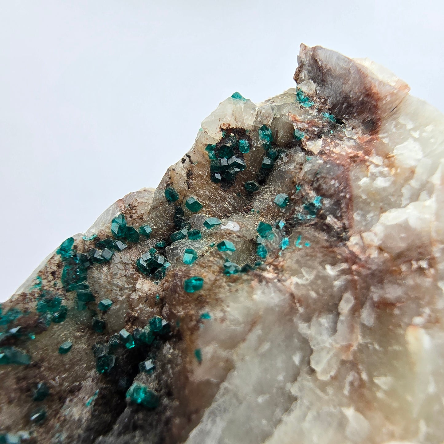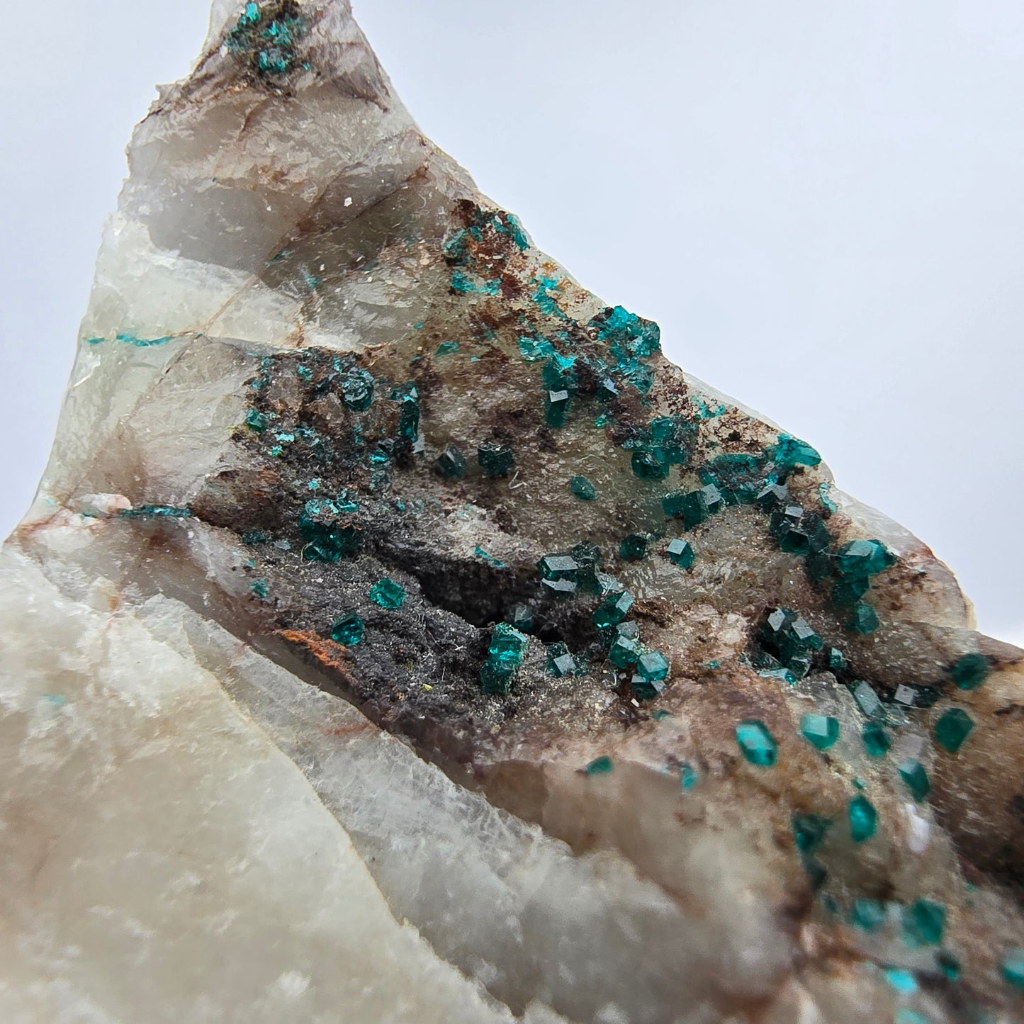 Découvrez cette exquise collection de minéraux rares avec ce spécimen saisissant de Dioptase. Les cristaux de dioptase sont de couleur turquoise foncé et ont une structure angulaire brillante. Partiellement transparents, les cristaux allongés se présentent sur une impressionnante matrice de cristaux de quartz blanc, qui soulignent le charme et la beauté uniques de ce spécimen minéral.