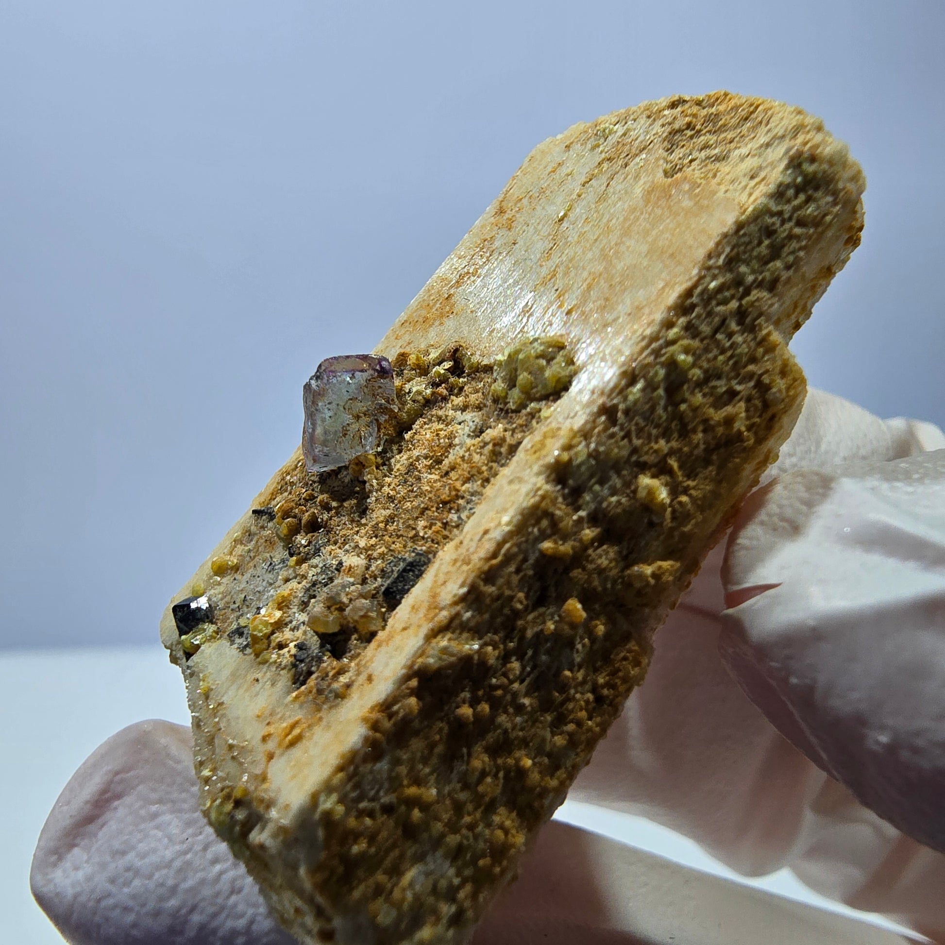 Ce spécimen minéral rare associe harmonieusement un cristal d'orthose blanc-beige, des cristaux de tourmaline schorl noire et un cube de fluorite verte. Cette pièce exceptionnelle, provenant d'Erongo (Namibie), mesure 41 x 22 x 14 mm et pèse 15 g.