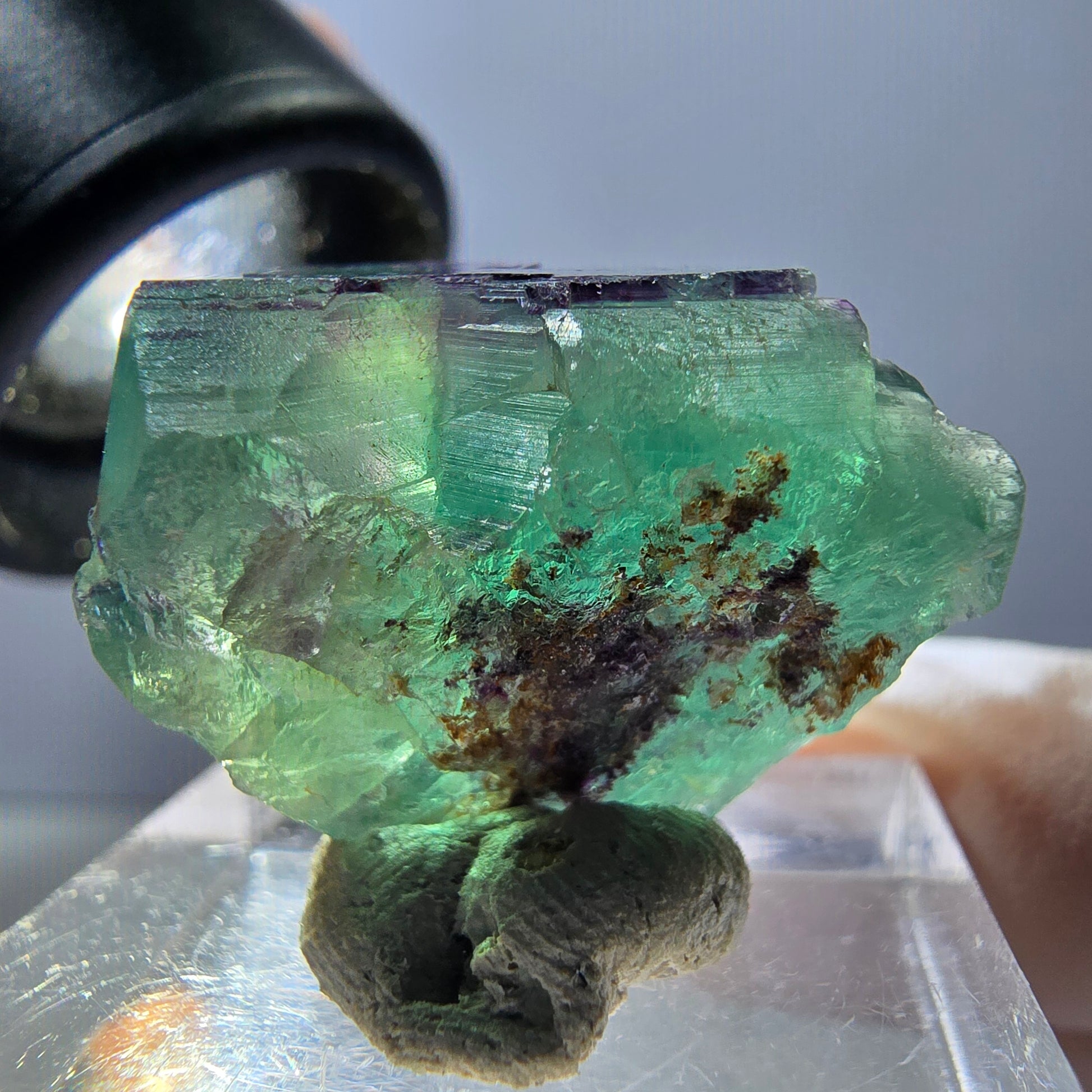 Découvrez ce rare spécimen cubique de fluorite transparent vert-violet, qui ravira collectionneurs et amateurs de minéraux. Cette formation exquise se caractérise par une clarté exceptionnelle et d'impressionnants cristaux cubiques, semblables à des grappes de raisin, qui révèlent des fantômes captivants. Parfait pour exposer ou enrichir votre collection.