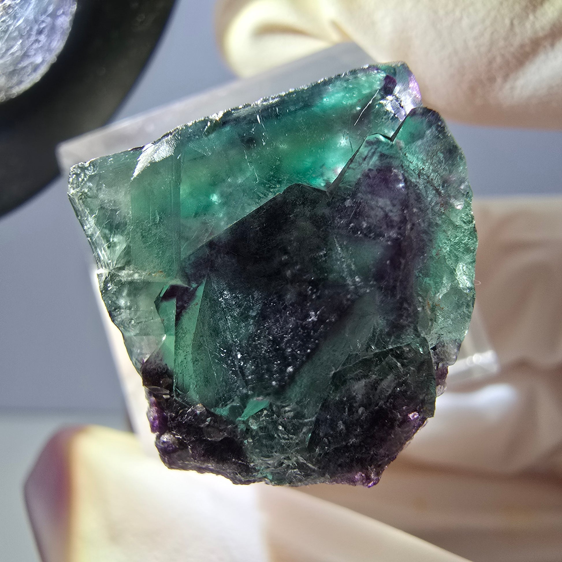 Découvrez notre exceptionnel et rare spécimen de fluorite cubique transparente vert-violet, captivant par ses fascinants cristaux cubiques et ses impressionnants fantômes. Originaire de la région d'Okorusu en Namibie, ce minéral rare apporte beauté et énergie unique à votre intérieur.