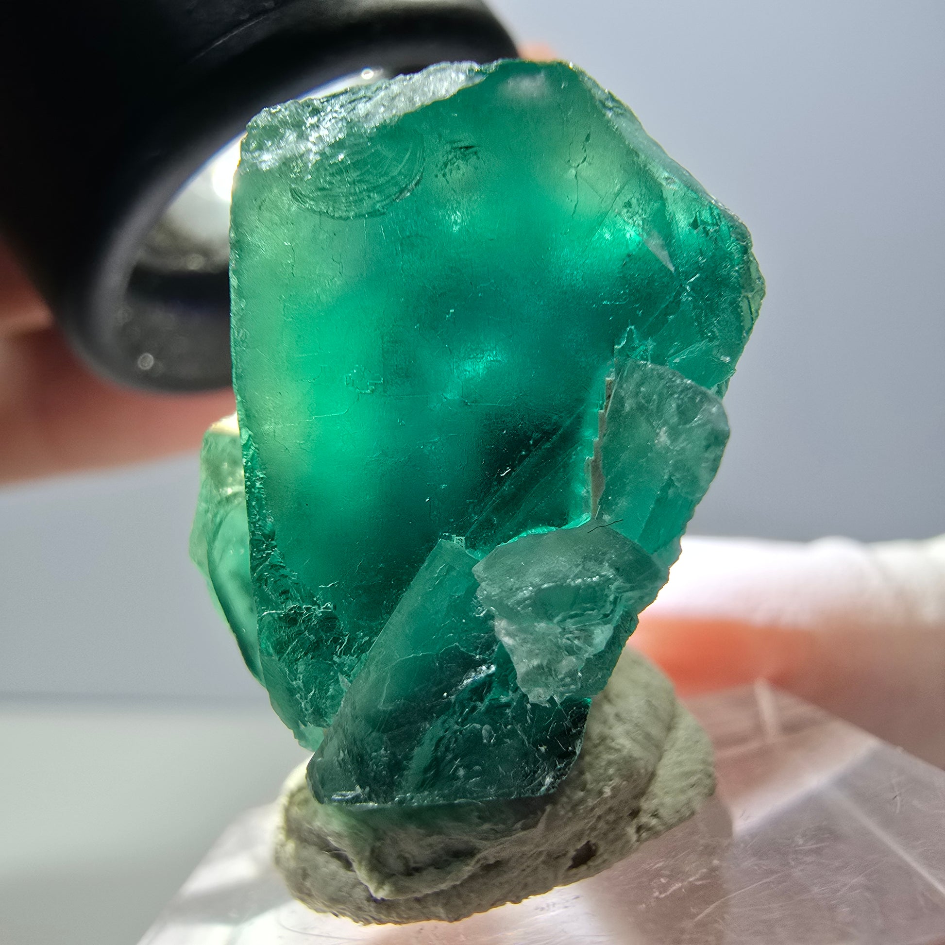 Ce spécimen cubique de fluorite mesure 27 mm de large, 25 mm de haut et 17 mm d'épaisseur. Avec un poids de seulement 19 g, il est à la fois léger et facile à manipuler. Ce minéral exceptionnel a été découvert à Okorusu, en Namibie, une région réputée pour la qualité de ses minéraux.