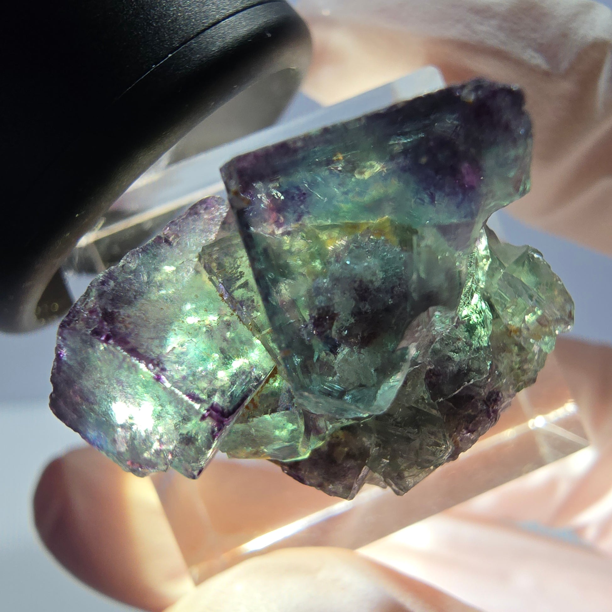 Découvrez notre spécimen exceptionnel : le rare cube de fluorite transparent vert-violet. Mesurant 28 x 20 x 18 mm et pesant 11 g, ce cristal est non seulement un véritable accroche-regard, mais aussi un véritable rêve pour les collectionneurs. Ces cristaux cubiques, finement formés, présentent de fascinantes inclusions fantômes qui reflètent magnifiquement la lumière, créant un jeu de couleurs impressionnant.
