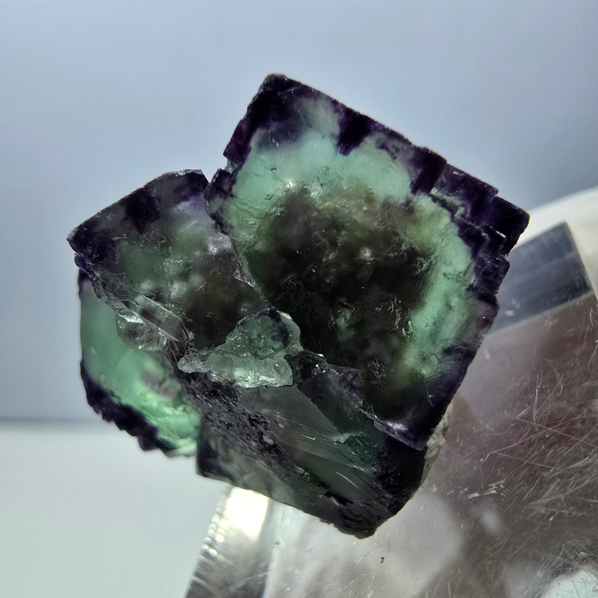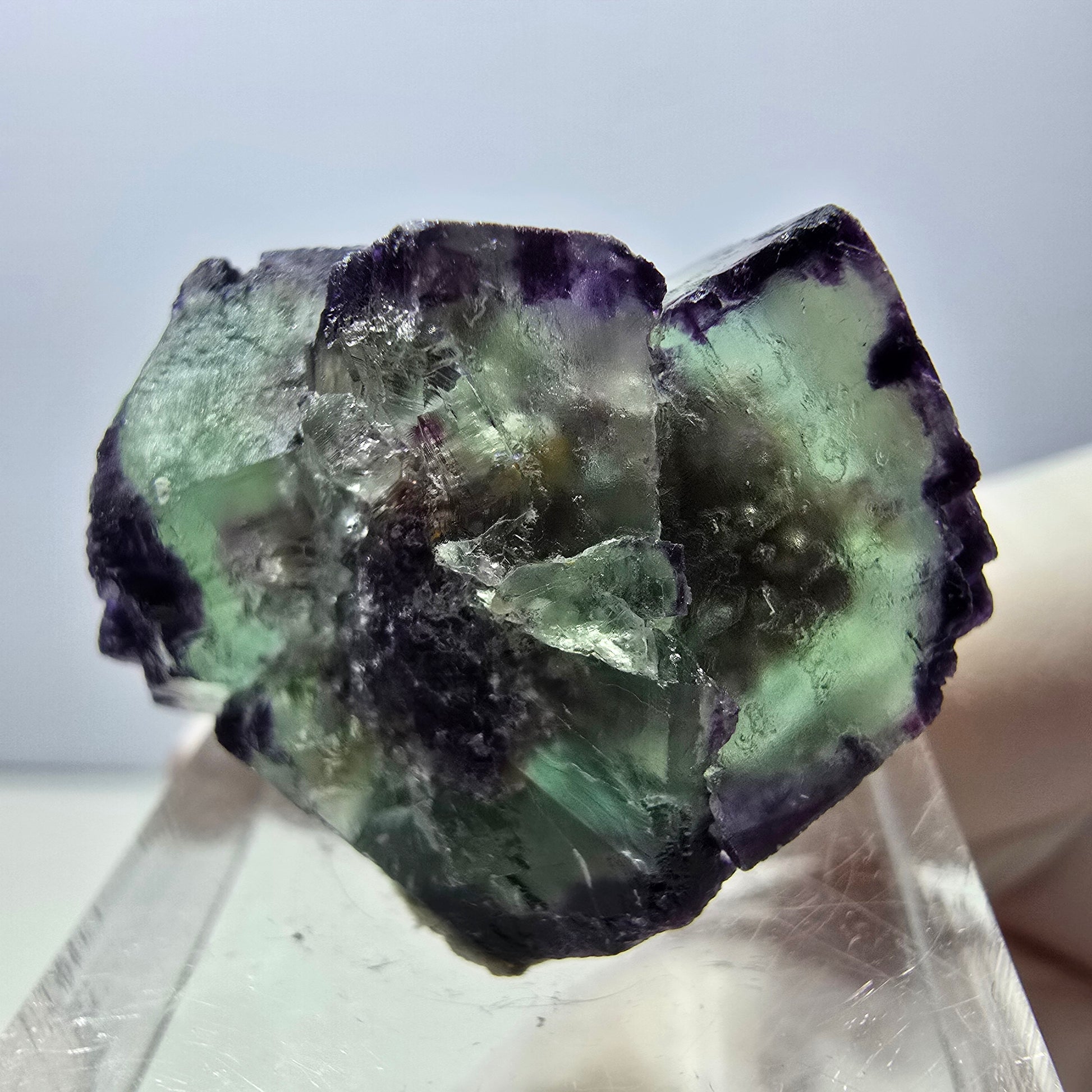 Découvrez ce magnifique et rare spécimen de cube de fluorite transparent vert-violet. Avec sa couleur éclatante et ses remarquables cristaux cubiques, c'est une véritable pièce de collection. Les cubes de fluorite renferment de fascinants fantômes, ce qui leur confère une touche vraiment unique.