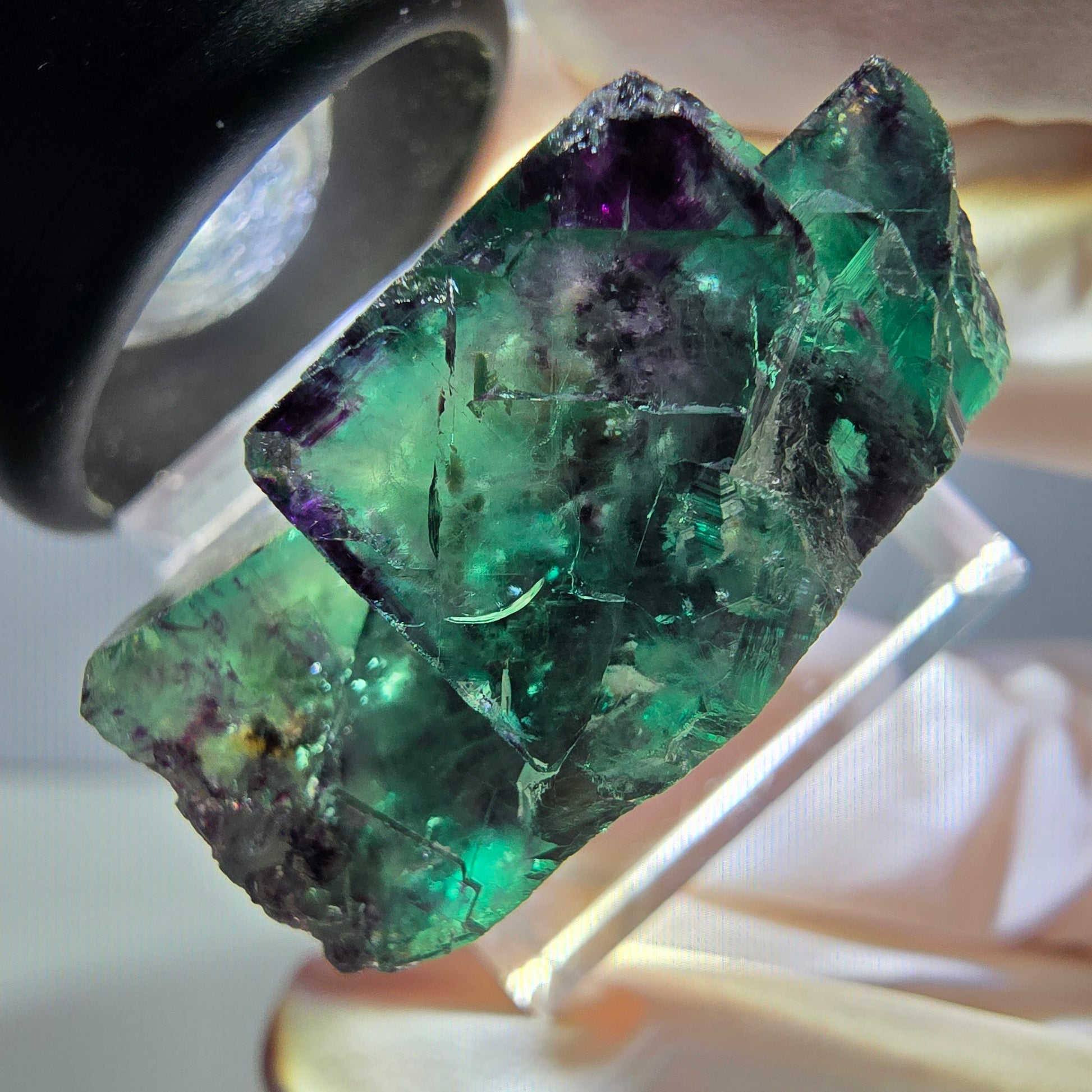 Découvrez cet exceptionnel et rare spécimen cubique de fluorite transparente vert-violet. Mesurant 30 x 21 x 14 mm et pesant 19 g, ce magnifique cristal se révèle dans toute sa splendeur. Ses imposantes formes cubiques sont sublimées par de magnifiques fantômes, conférant à la pièce une aura unique et mystérieuse.