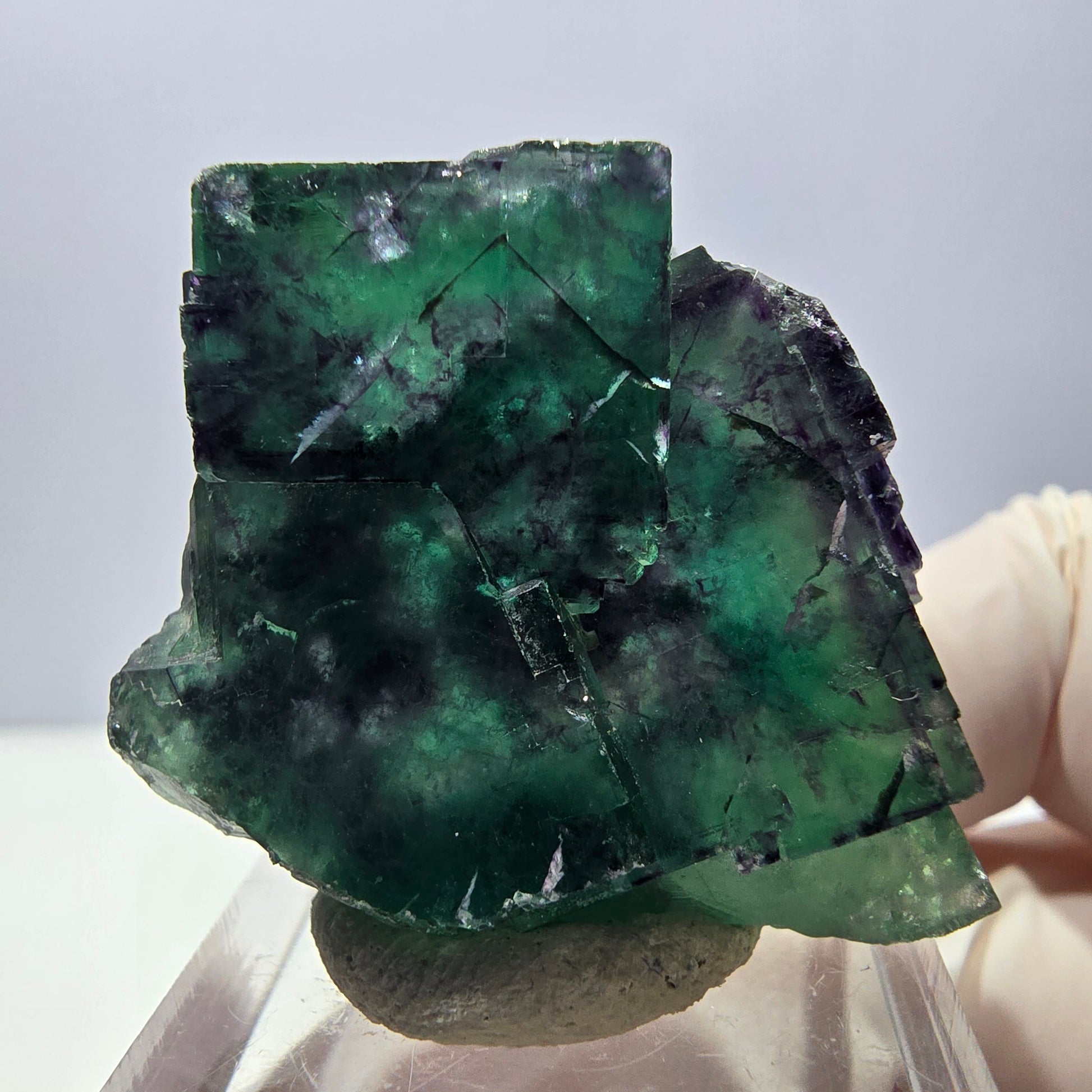 Découvrez notre cube de fluorite vert et violet unique et rare, orné d'impressionnants cristaux cubiques et de fascinants fantômes. Ce spécimen exceptionnel de fluorite mesure 33 x 32 x 16 mm et pèse 27 g, ce qui en fait un objet de collection idéal ou un objet décoratif.
